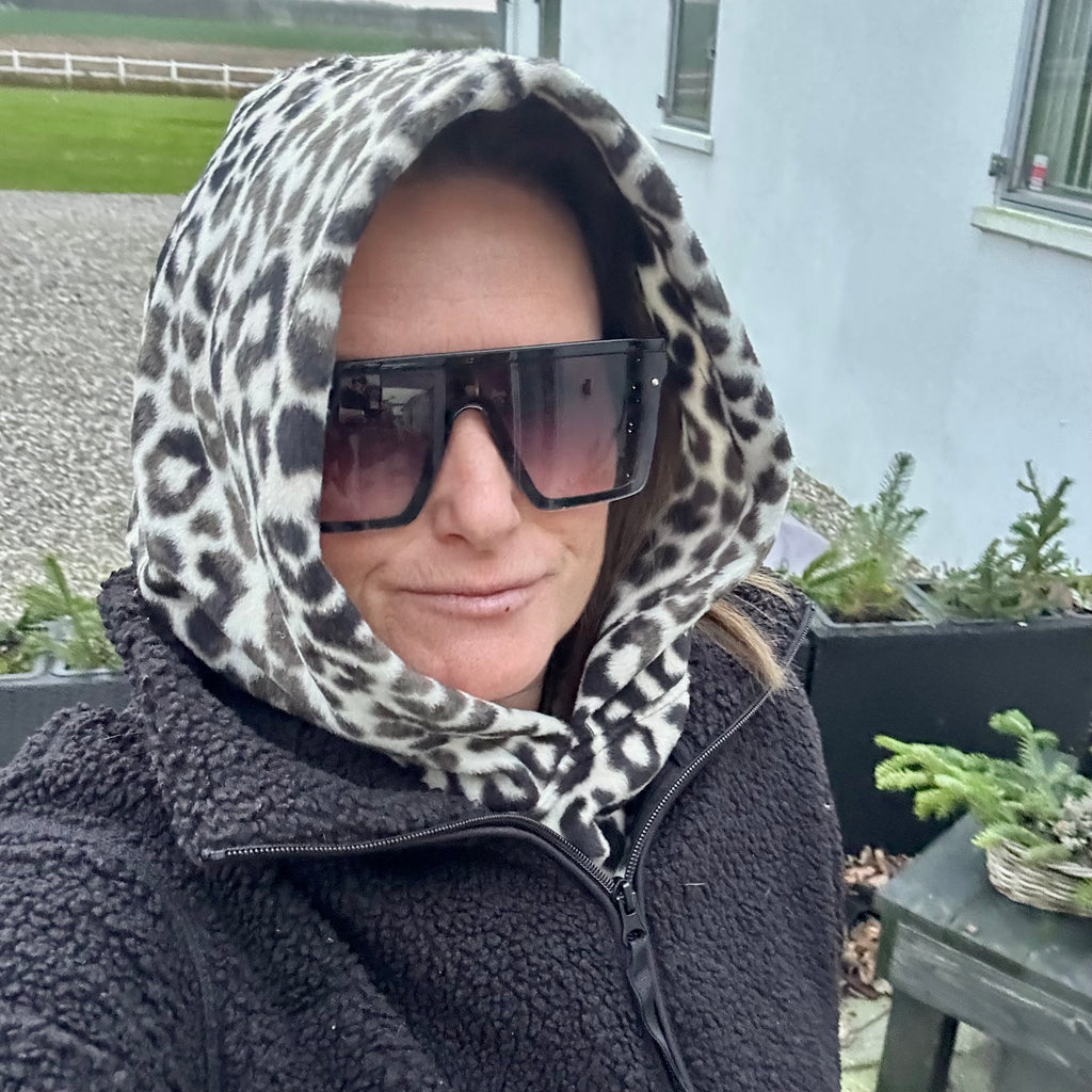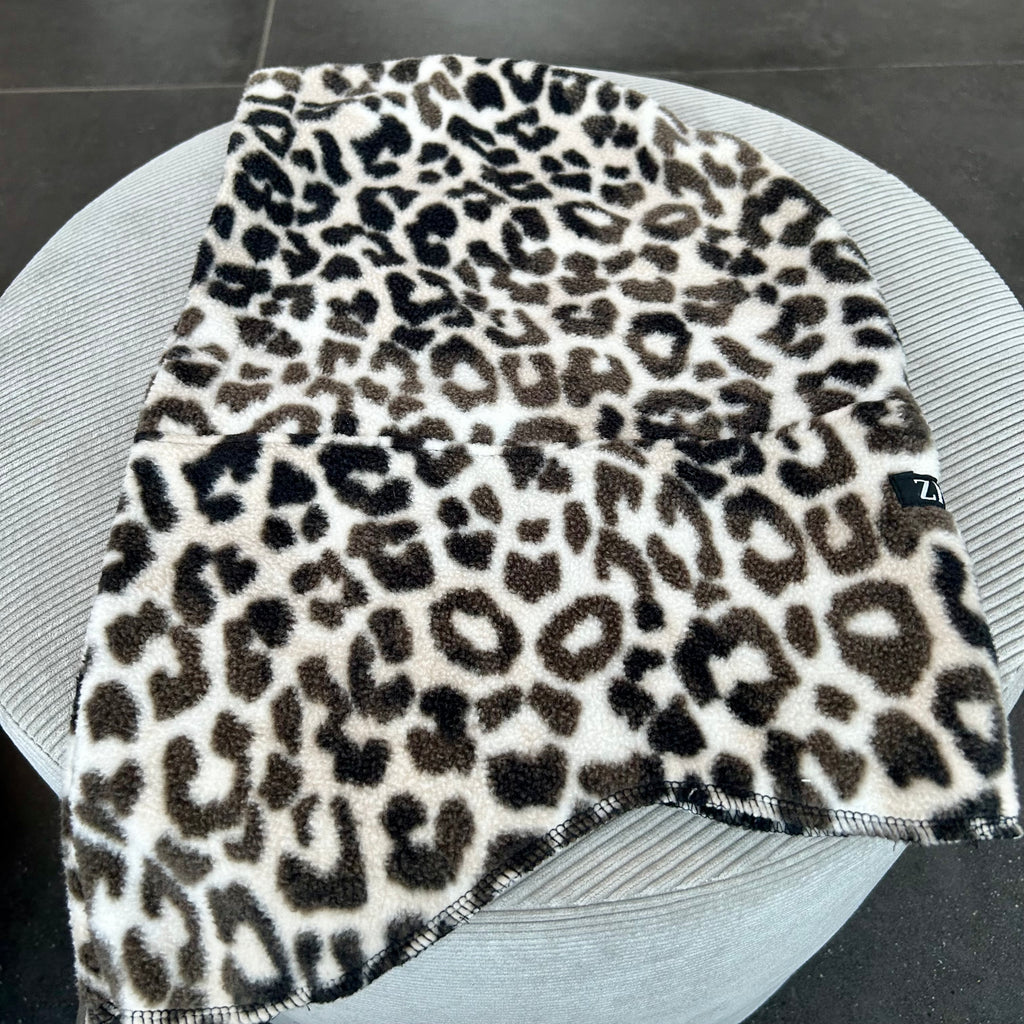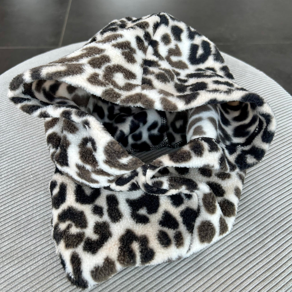 Balaclava i leopard mønstret fleece.