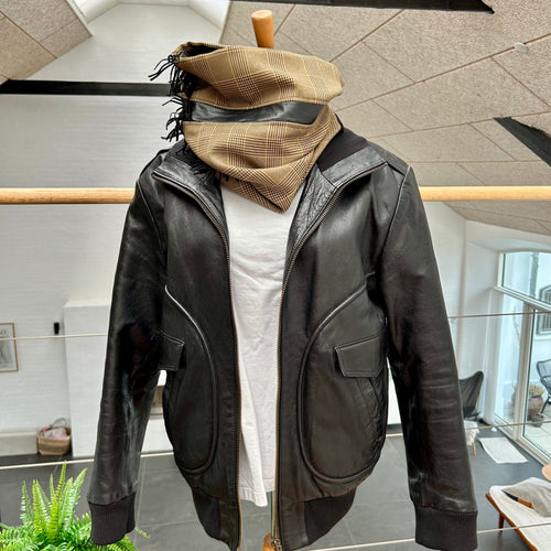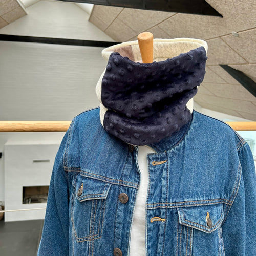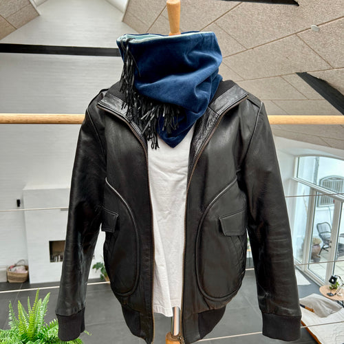 Unika halsedisse med cognac farvet stof og lammeskind.