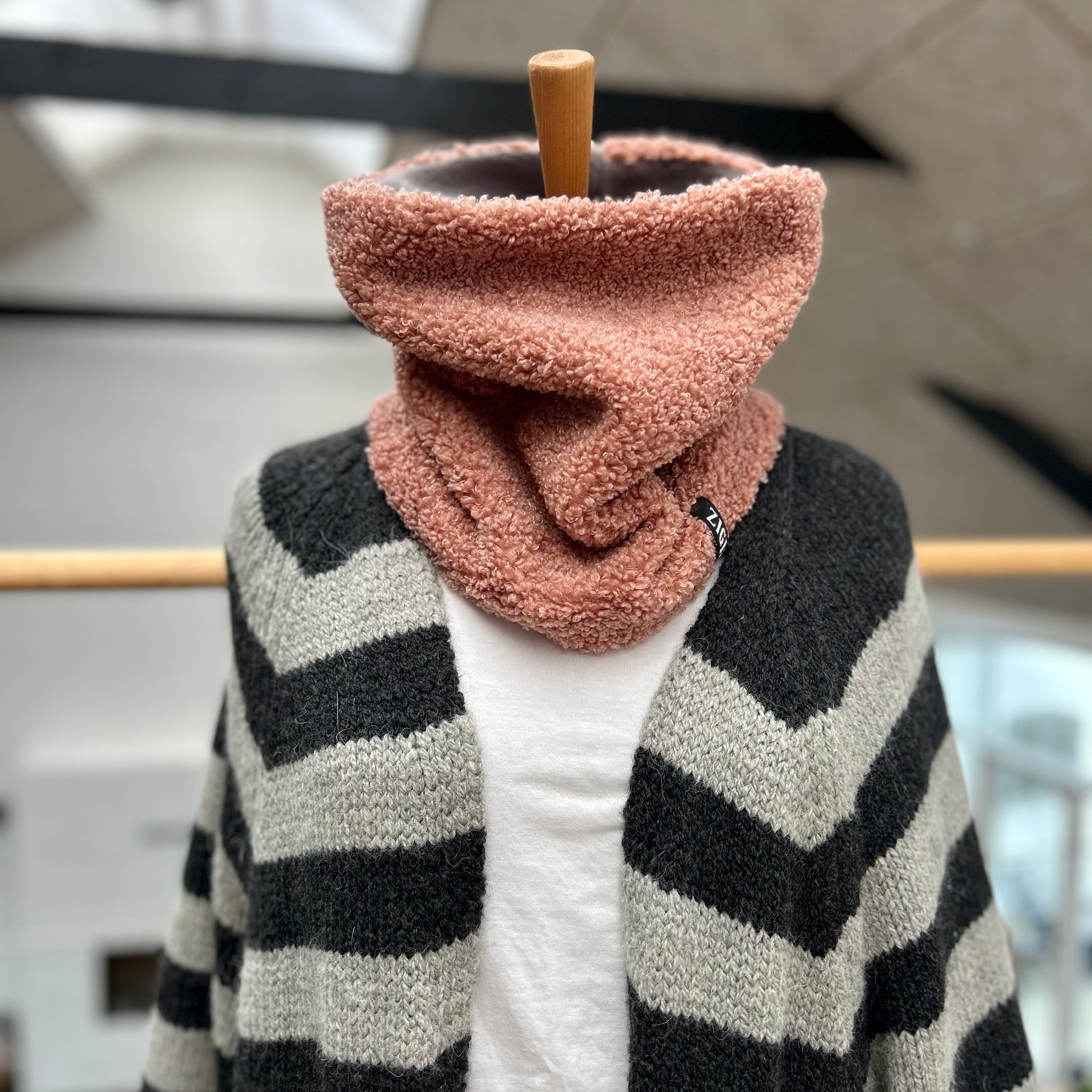 Bagsiden er beklædt med gråt fleece, men halsedissen kan vendes, så dette også vender ud af.