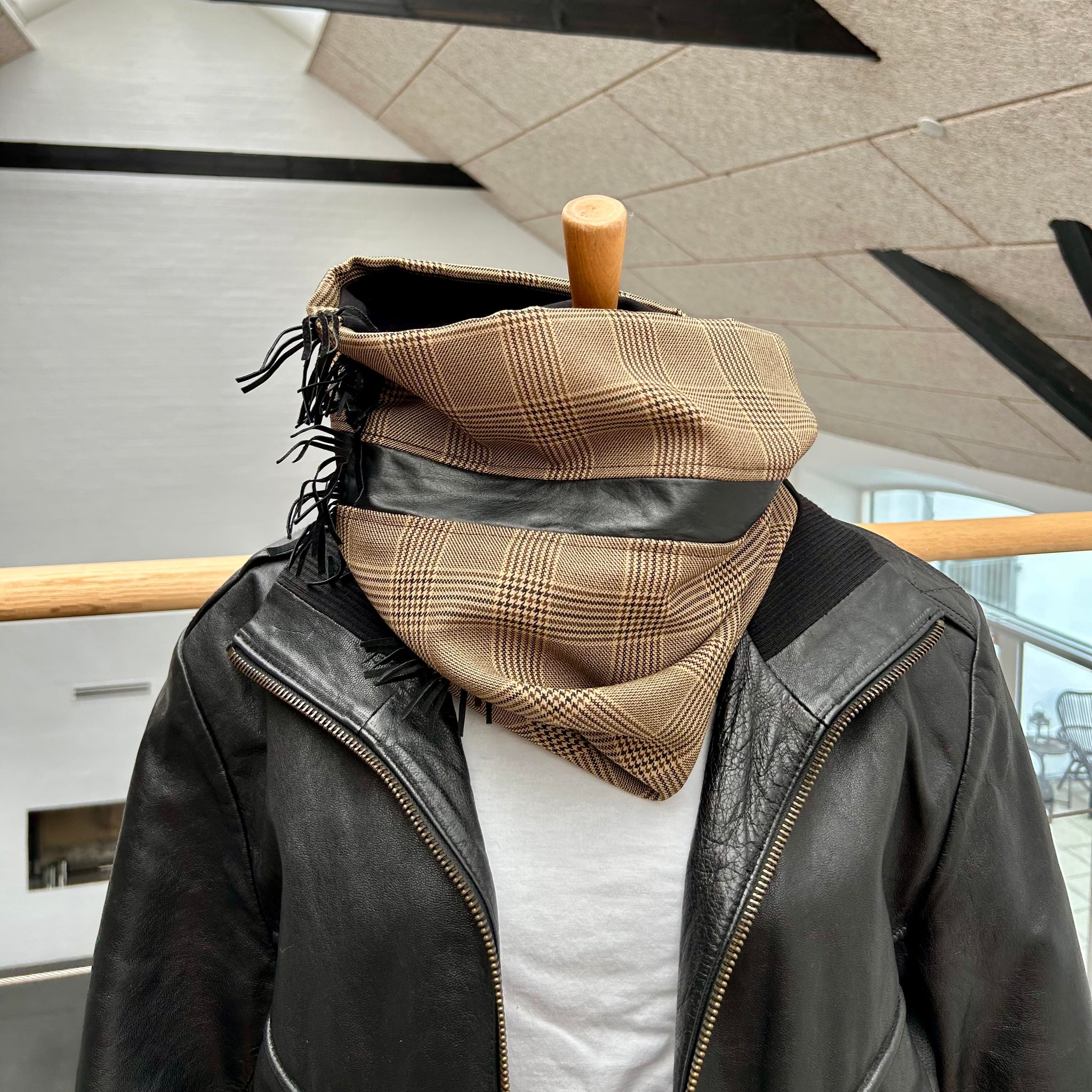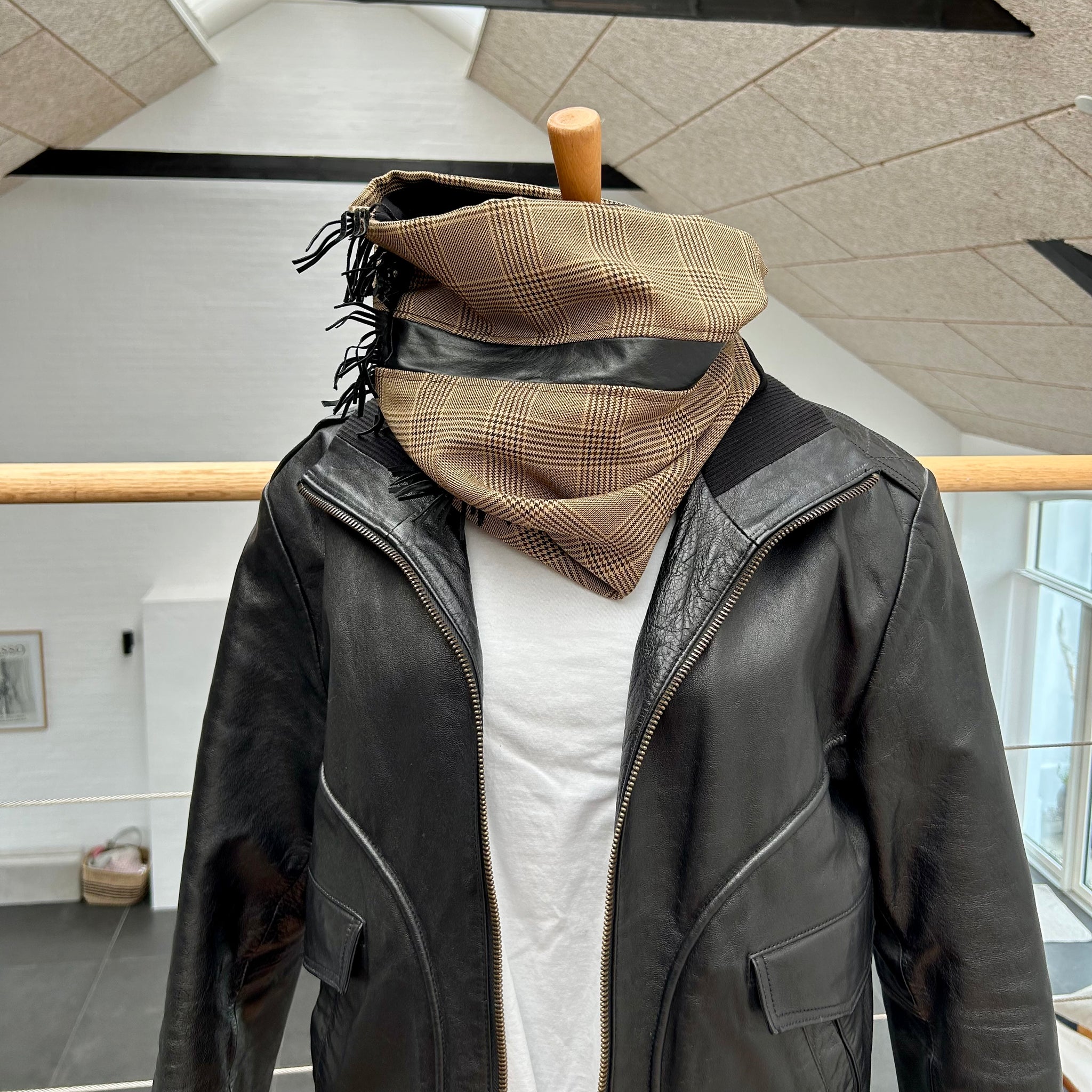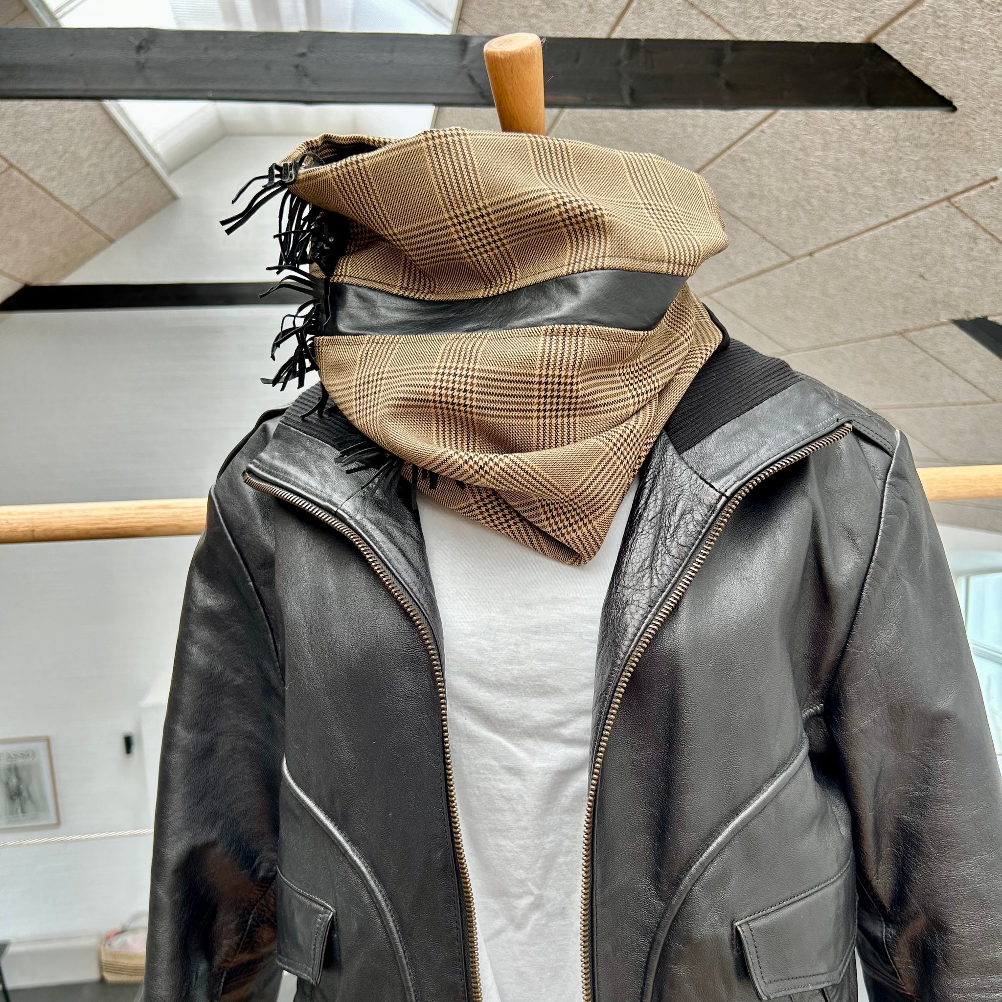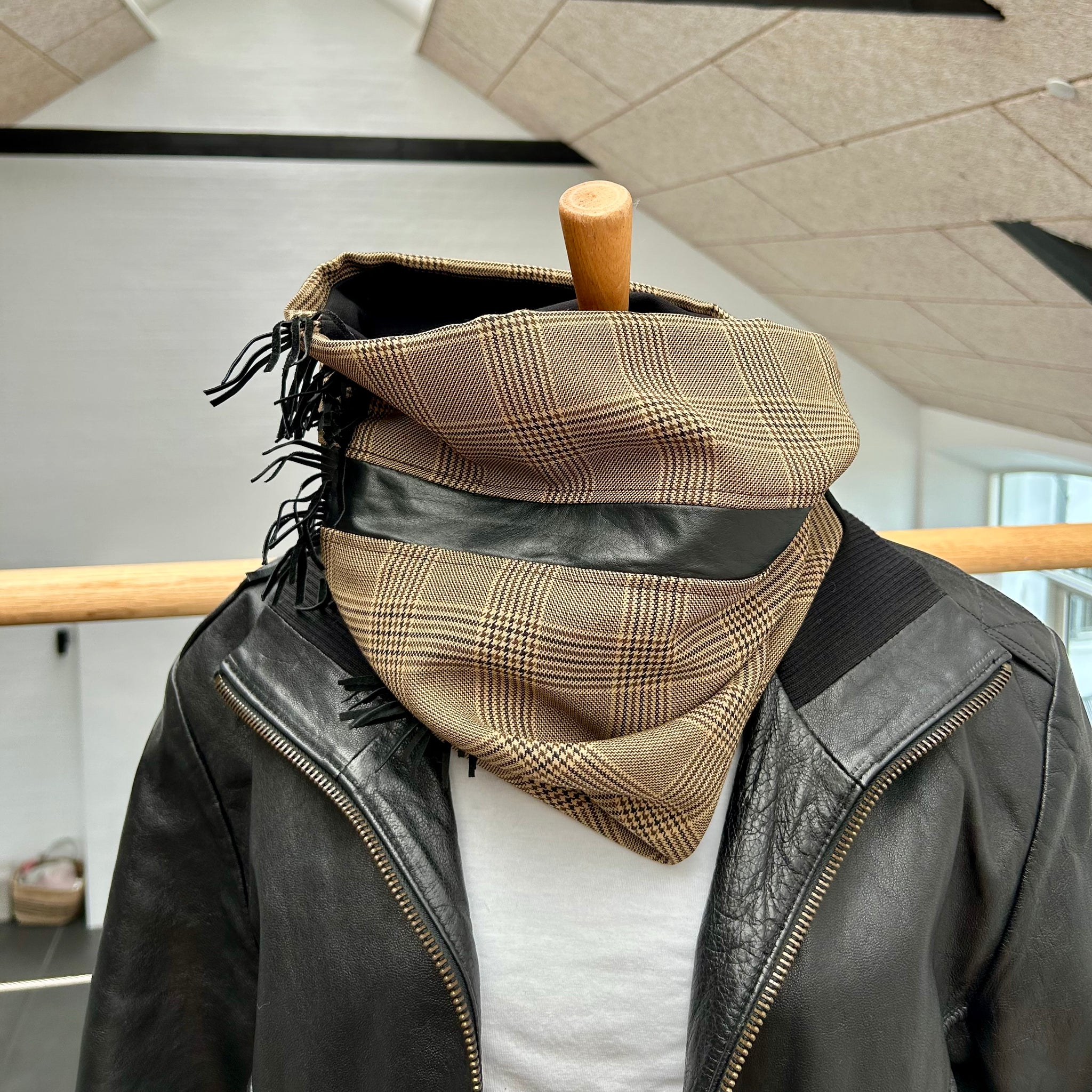 Lækker unika tube (Halsedisse) med tern og sort kalveskind syet ind imellem stoffet. Der er en lang stribe af håndklippede frynser også i sort kalveskind.