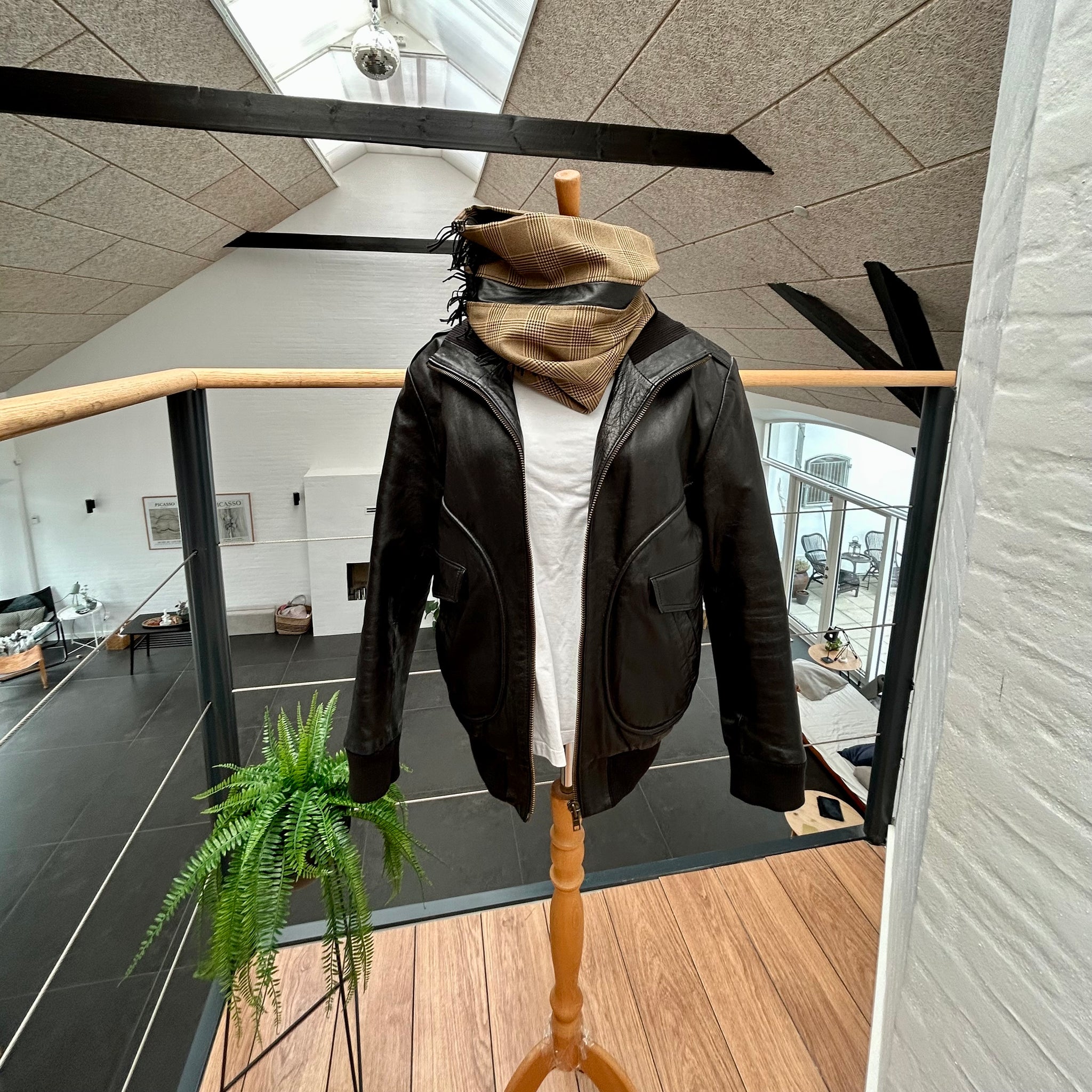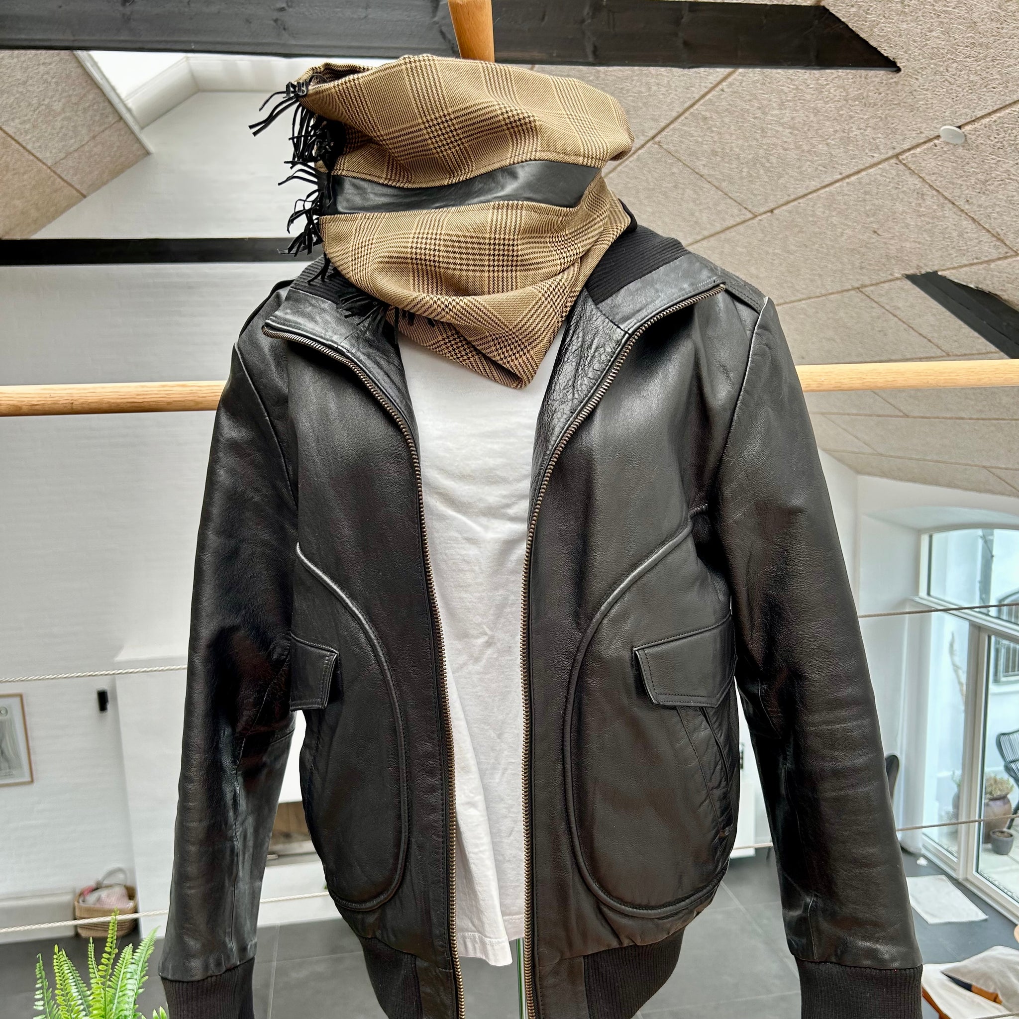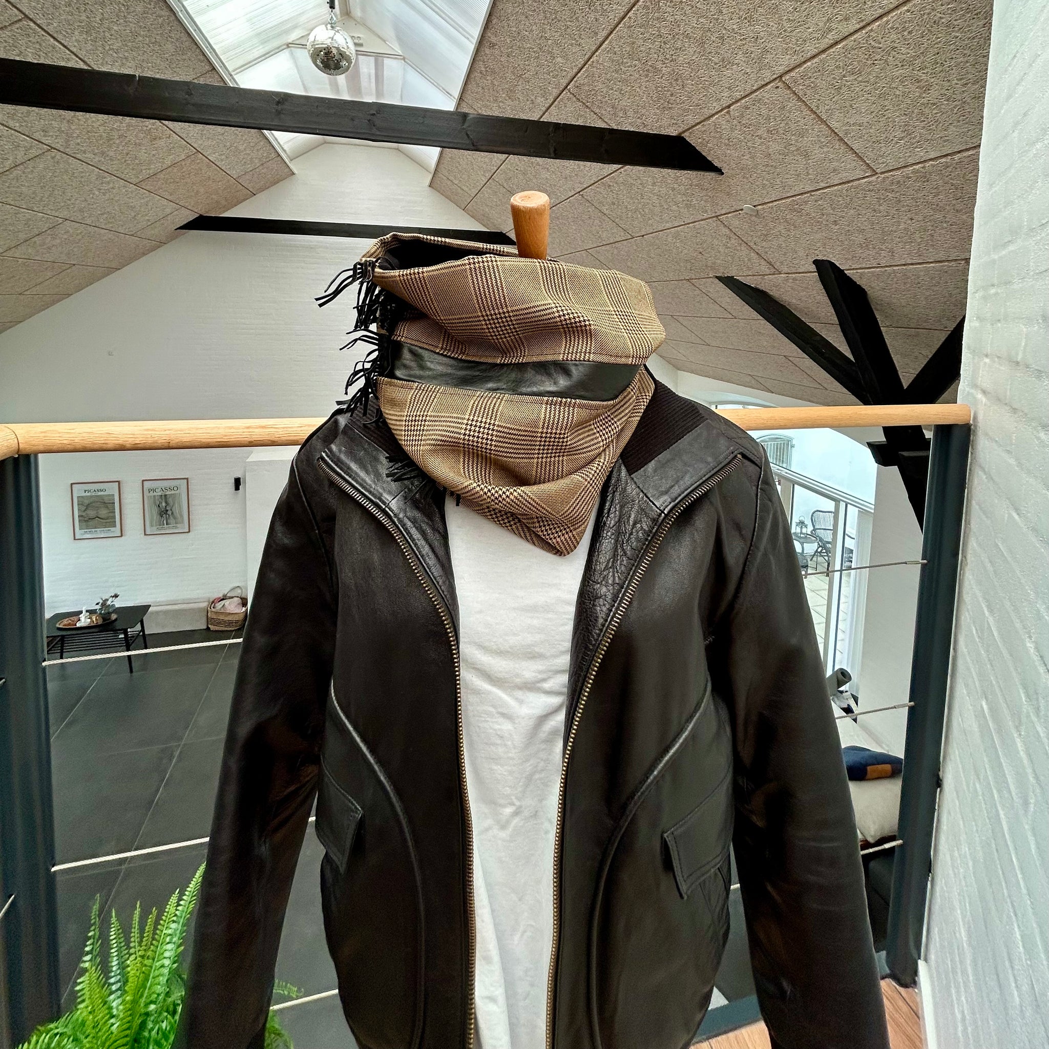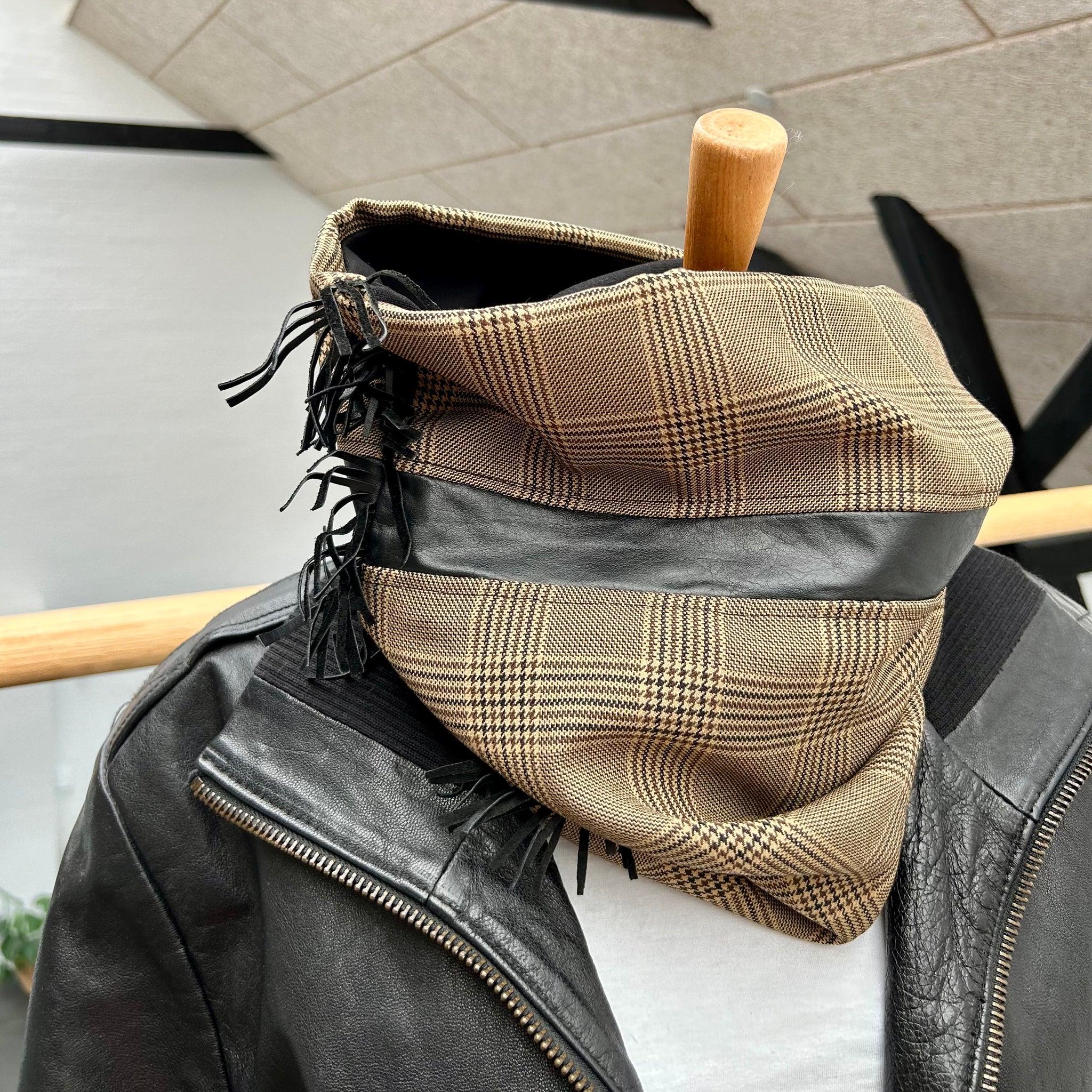 Lækker unika tube (Halsedisse) med tern og sort kalveskind syet ind imellem stoffet. Der er en lang stribe af håndklippede frynser også i sort kalveskind.