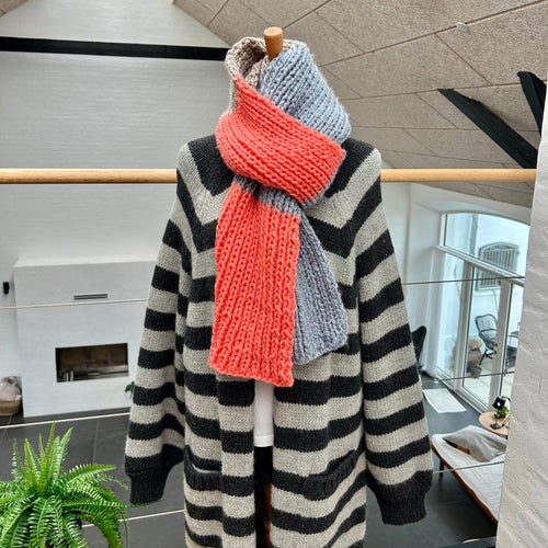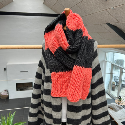 Håndstrikket jumbo halstørklæde i koral og antracitgråt garn