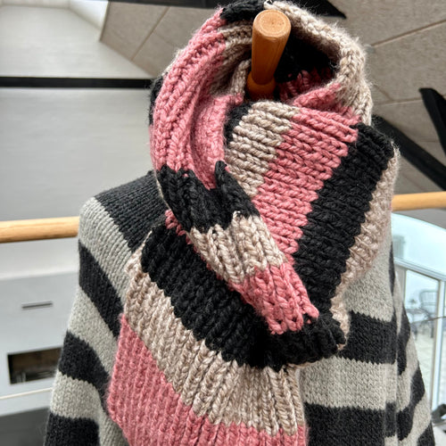 Håndstrikket jumbo tørklæde i rosa, nude og antrcit garn.