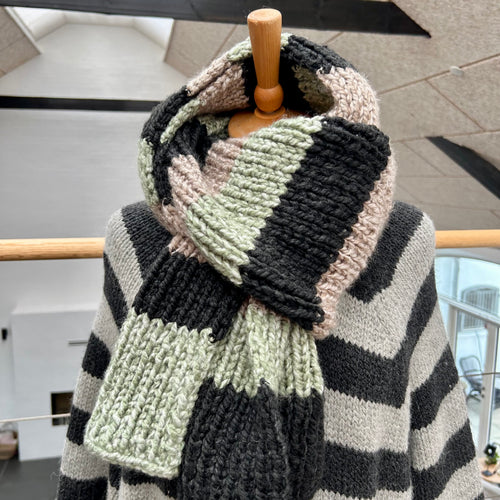 Håndstrikket jumbo tørklæde i grønlig og beige.