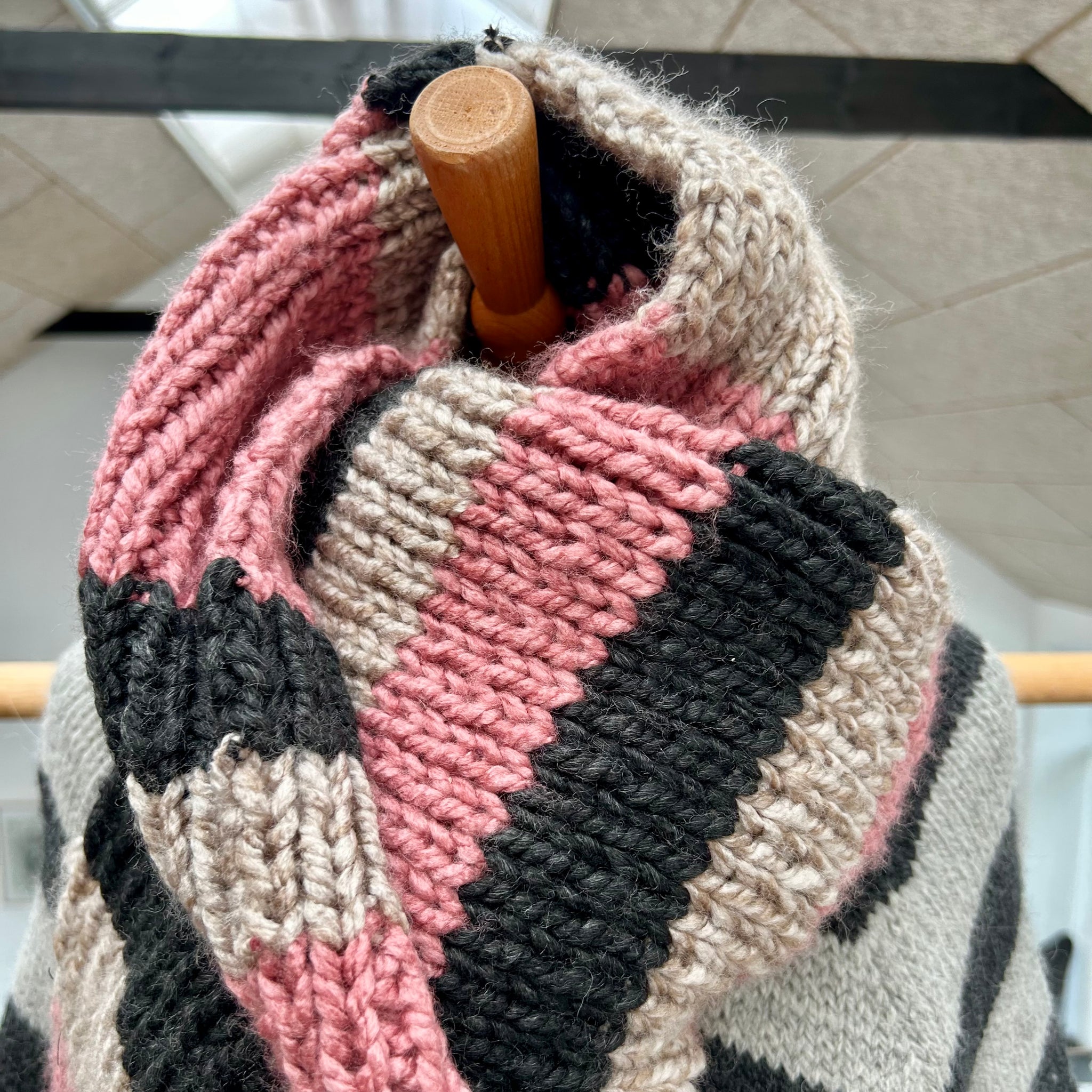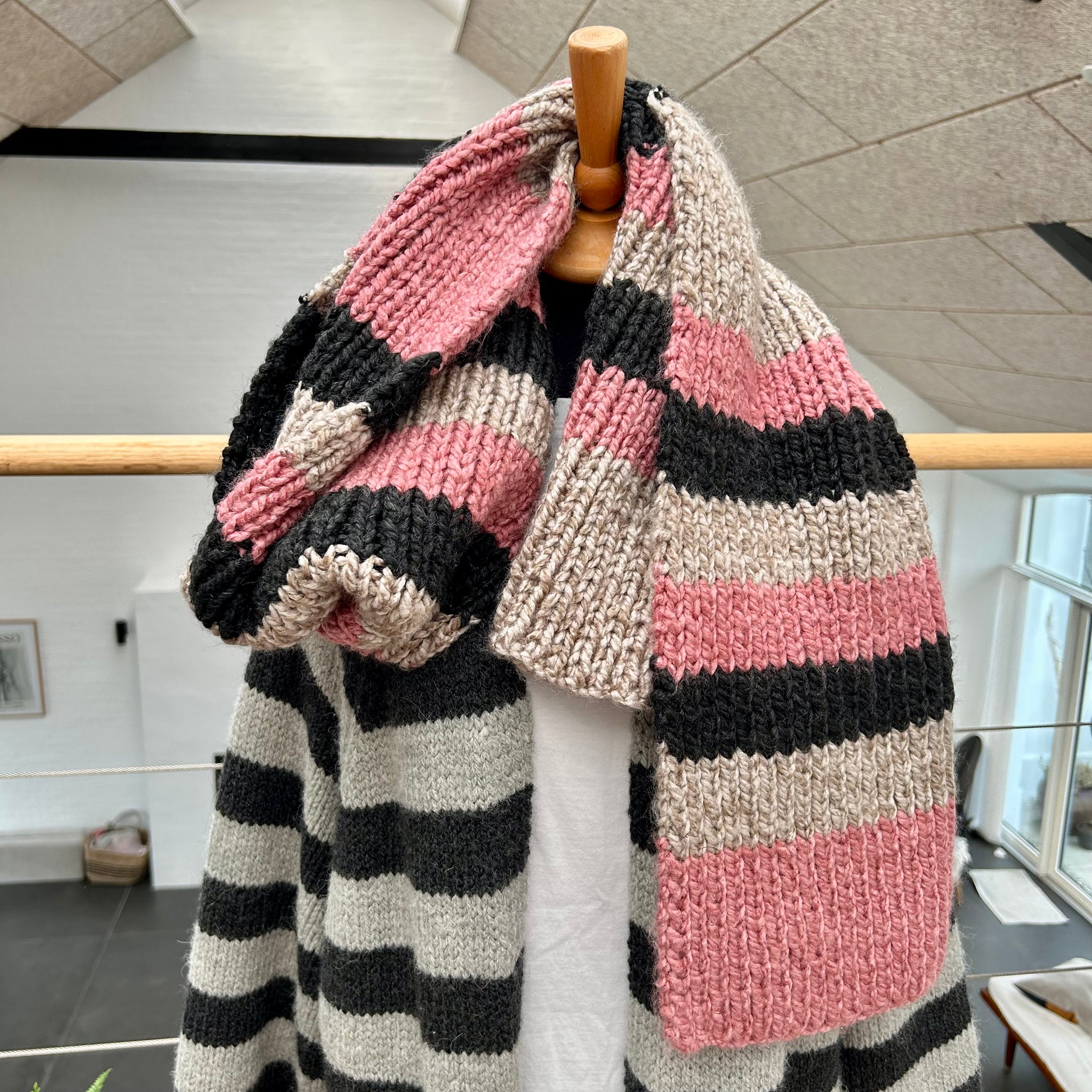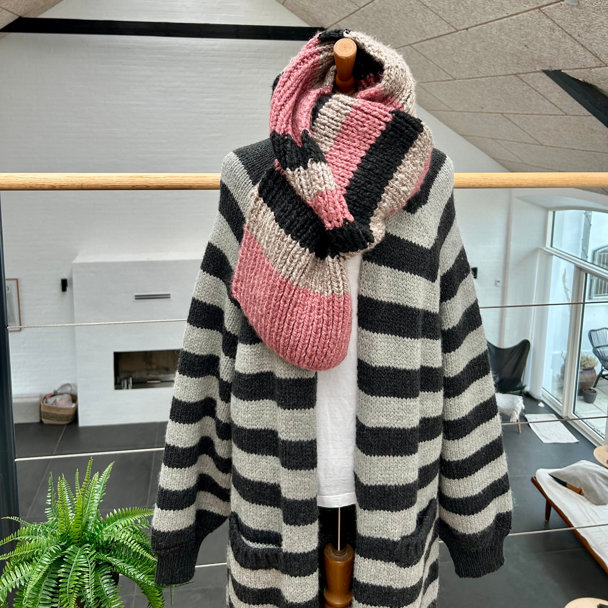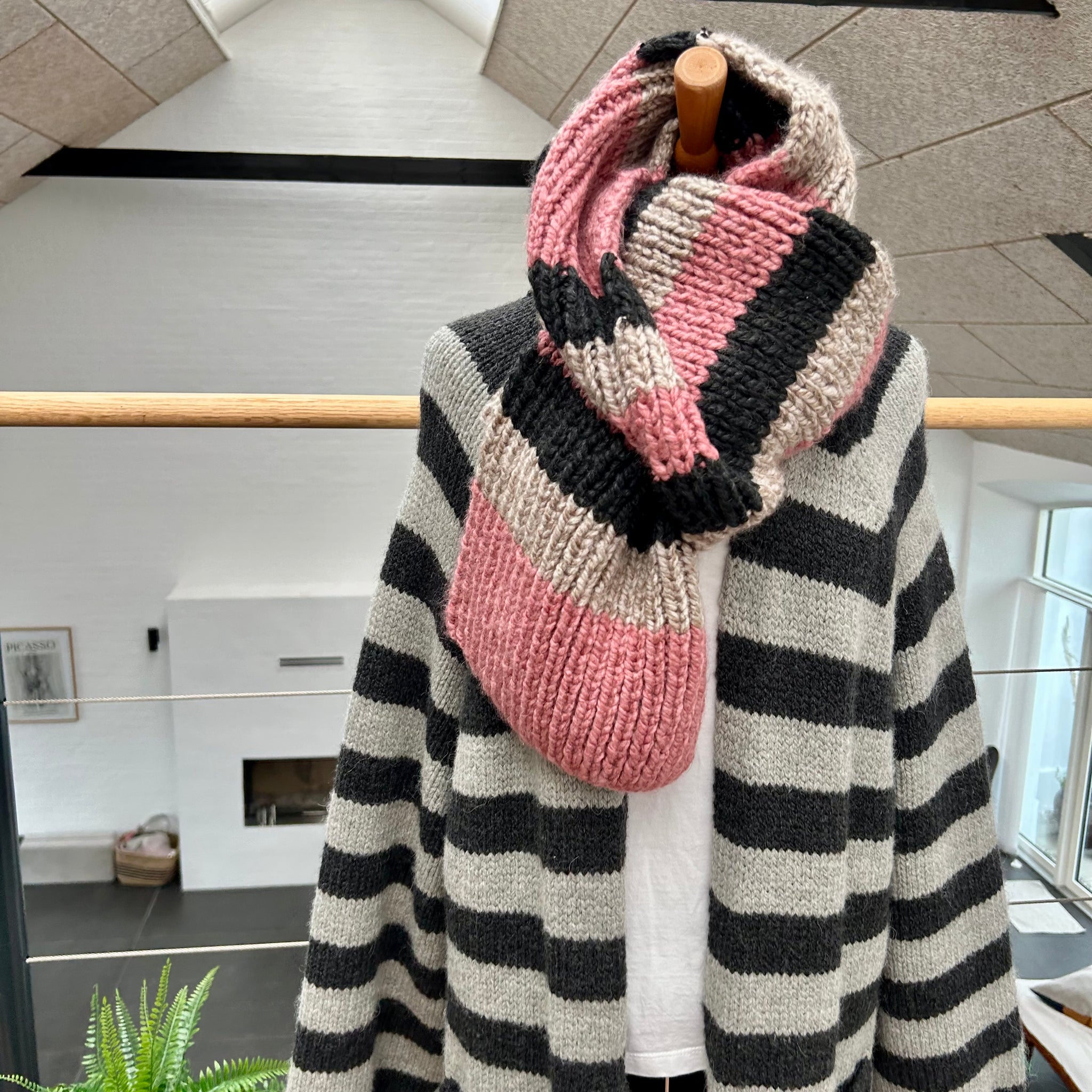 Håndstrikket jumbo tørklæde i rosa, nude og antrcit garn.