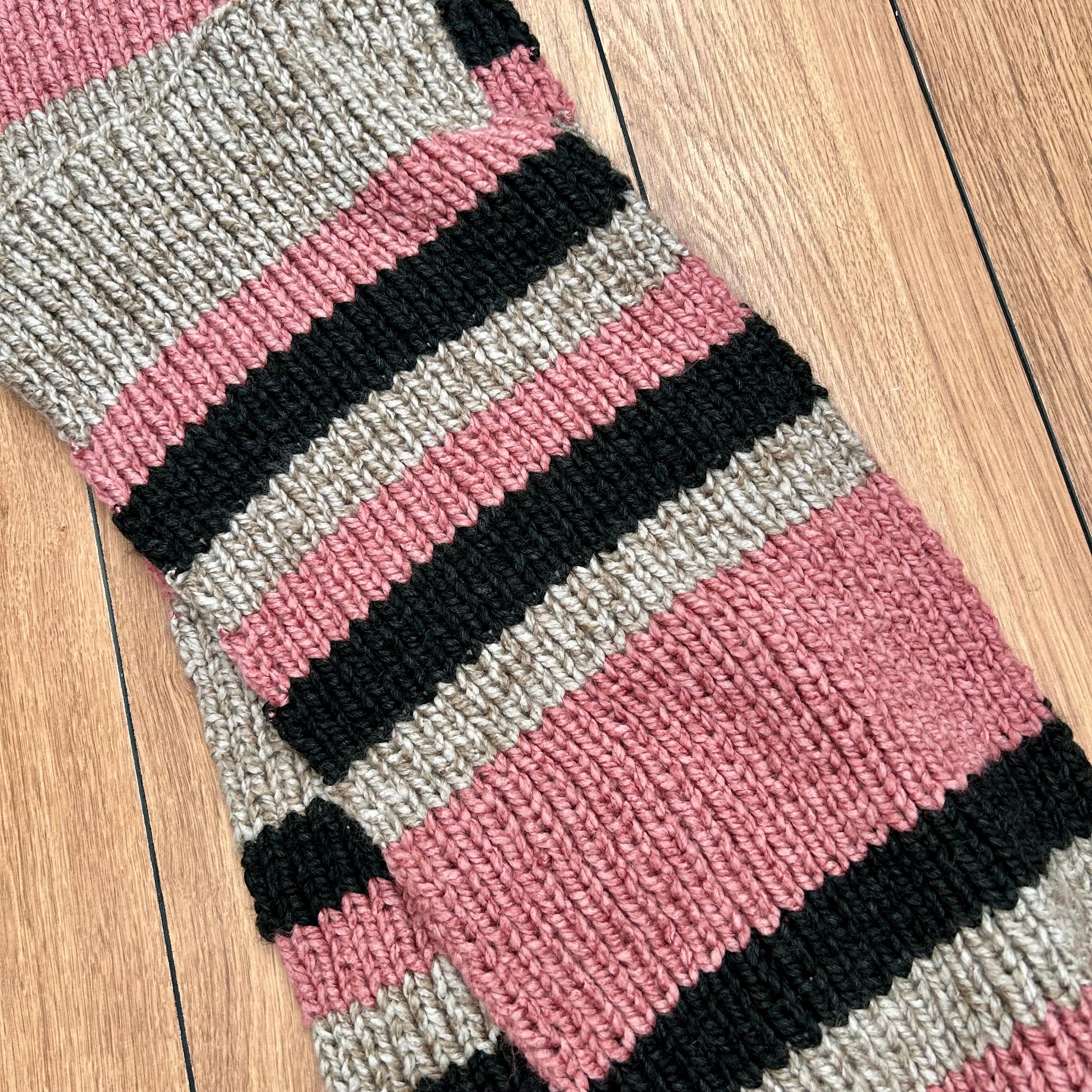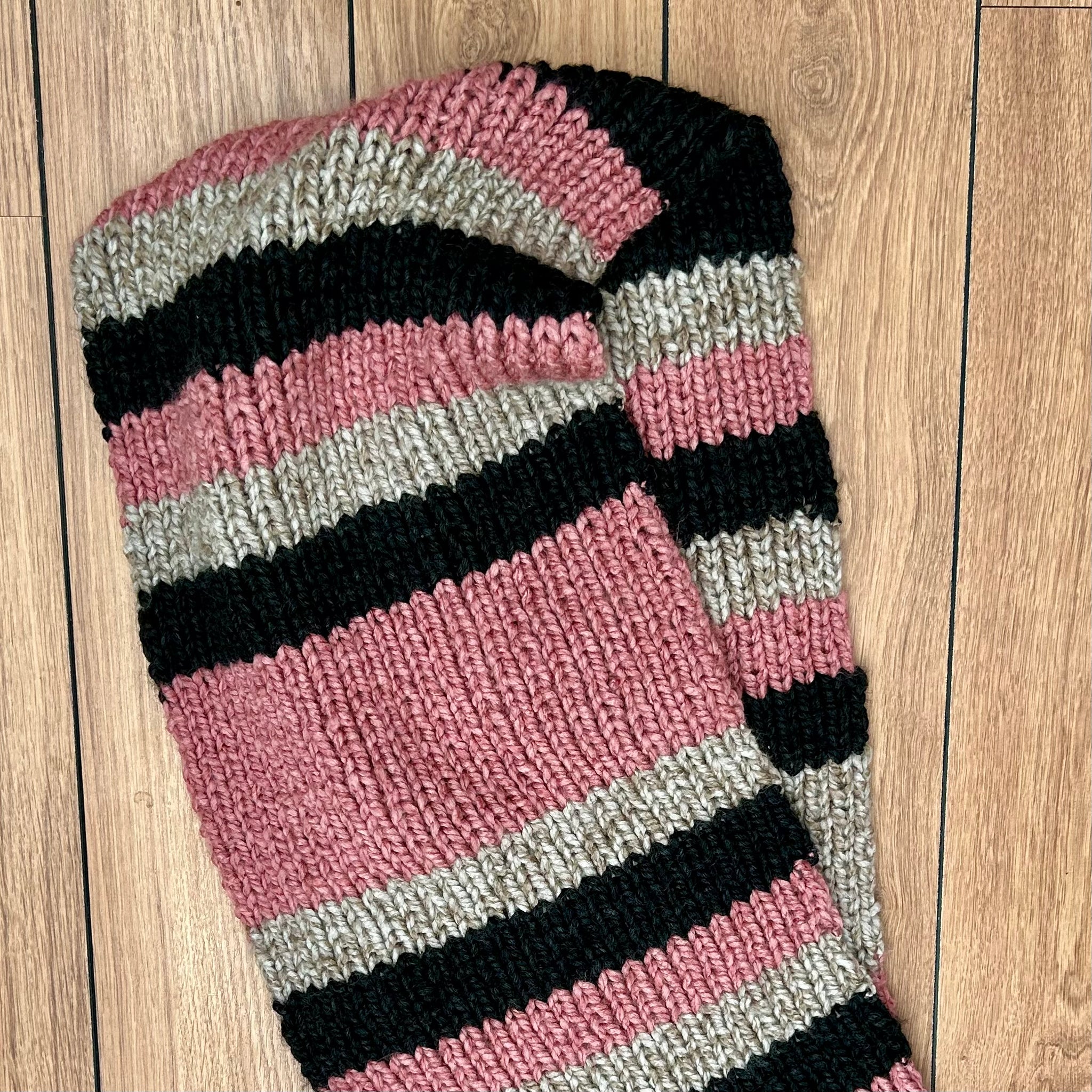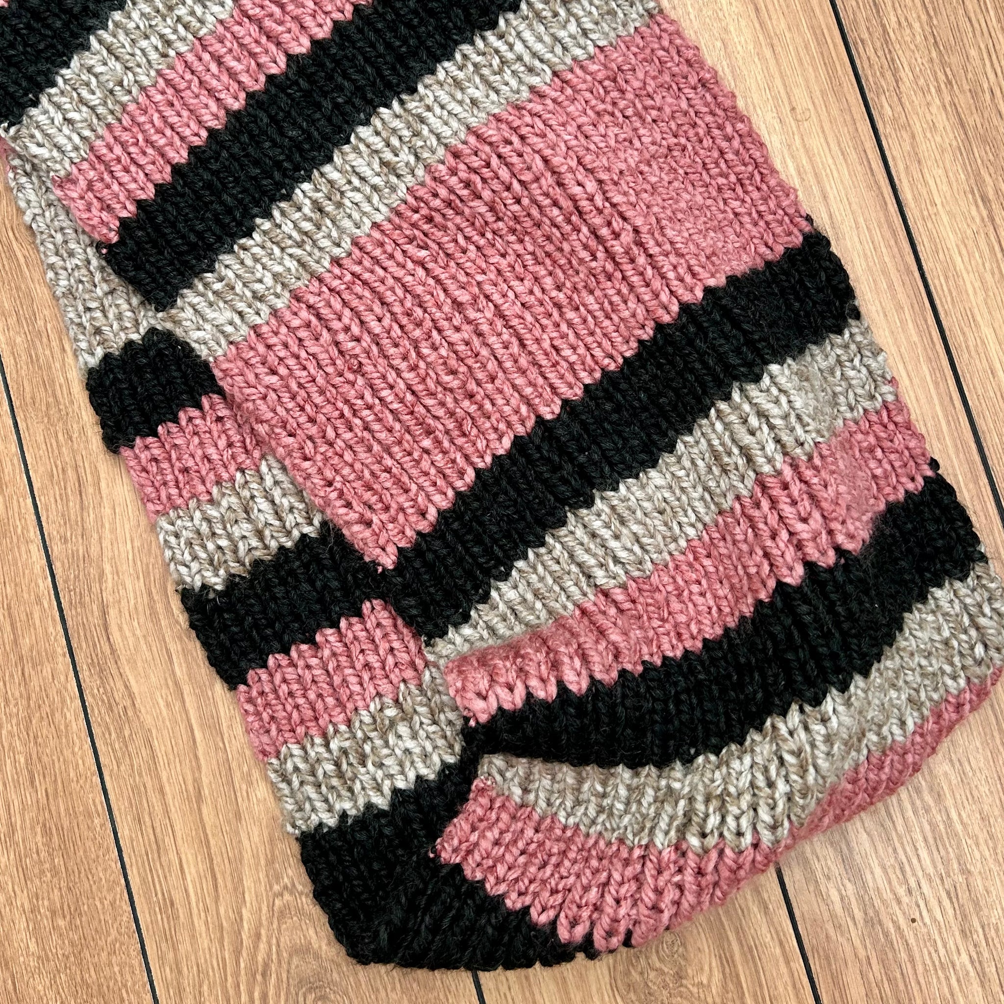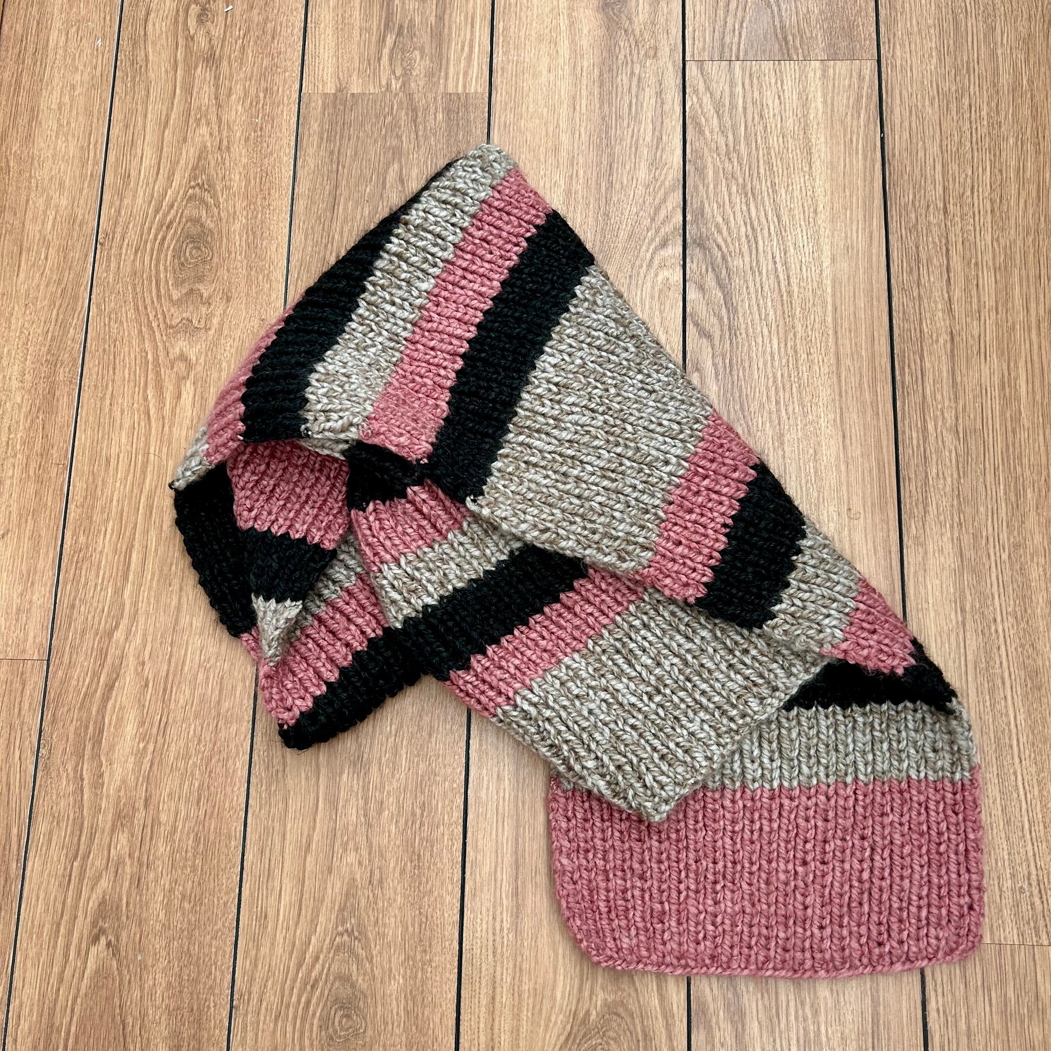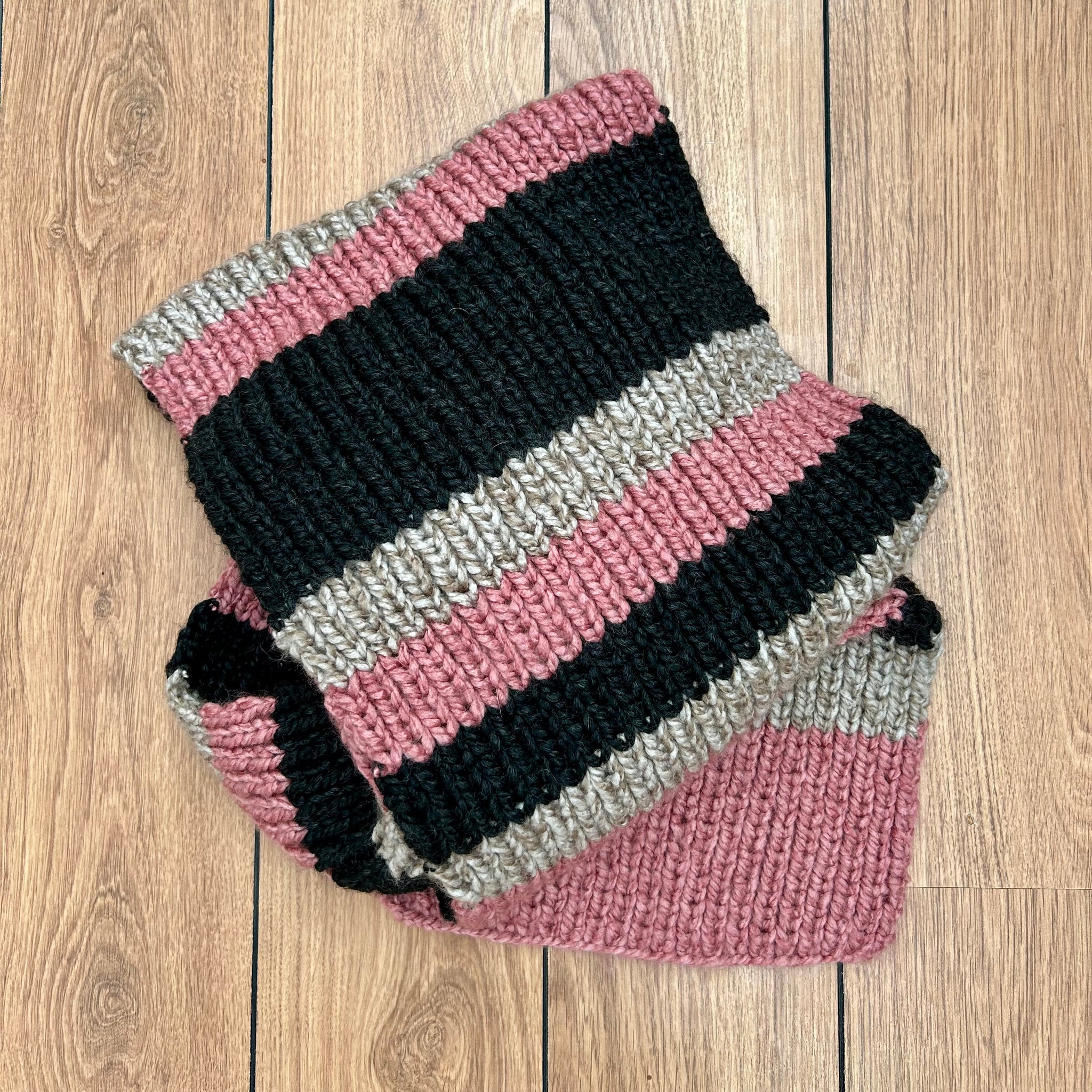Håndstrikket jumbo tørklæde i rosa, nude og antrcit garn.