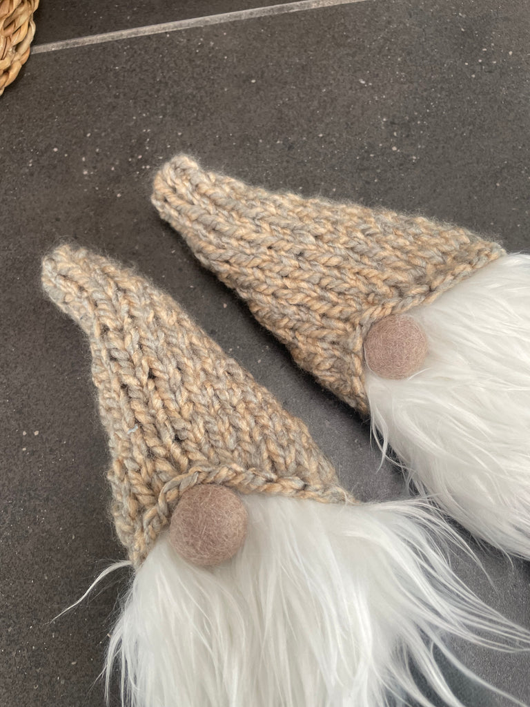 Gnomerne er lavet af stof og huerne er strikket i tykt garn.