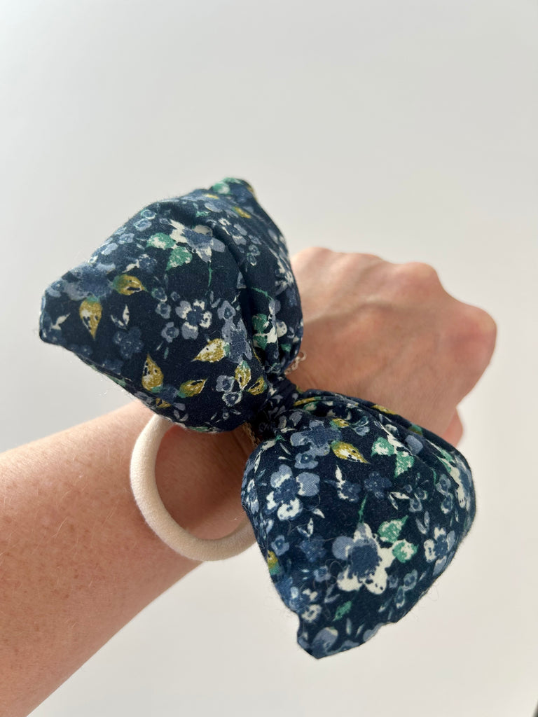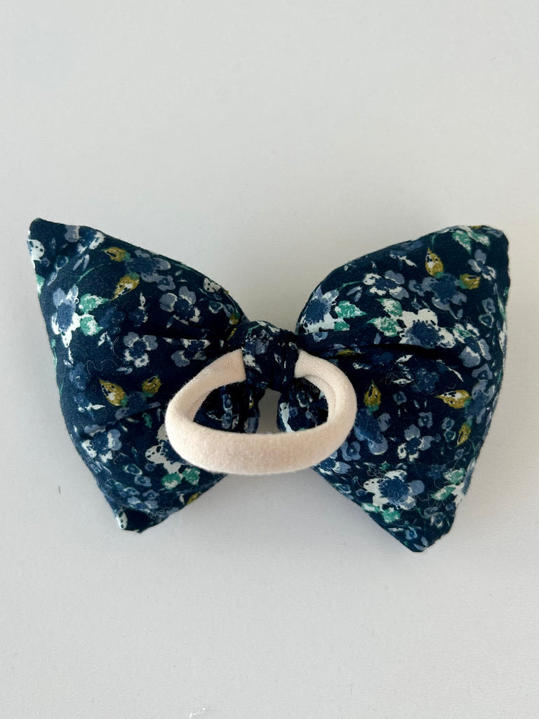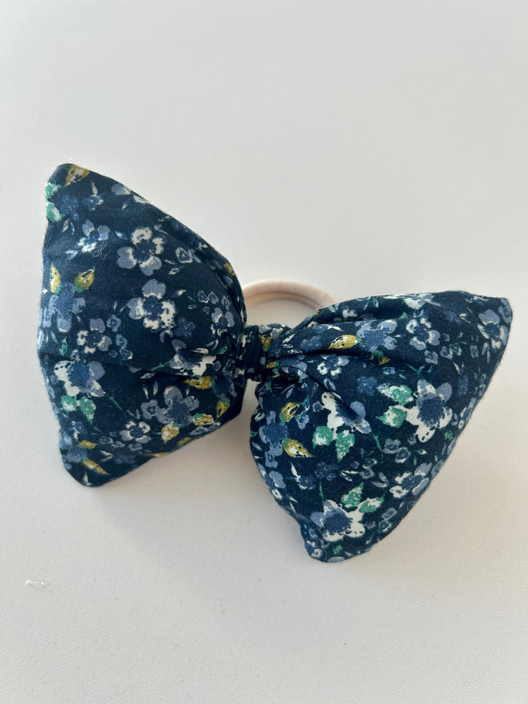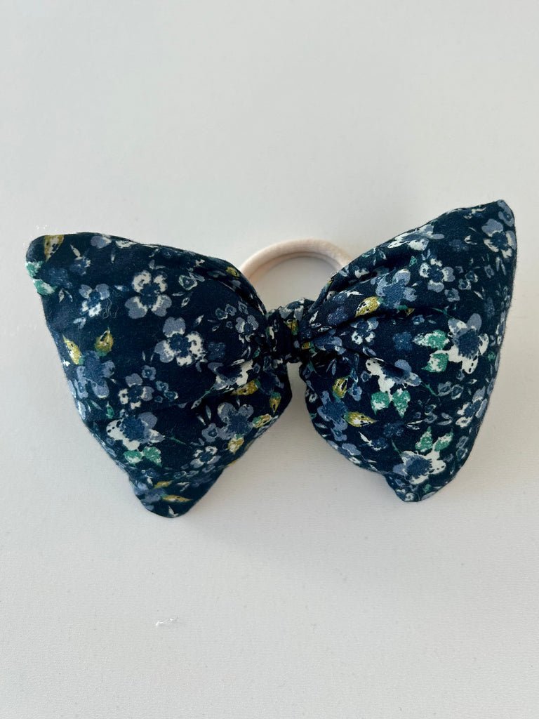 Fluffy blomstret sløjfe i blålige farver.