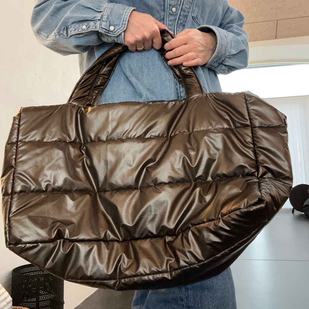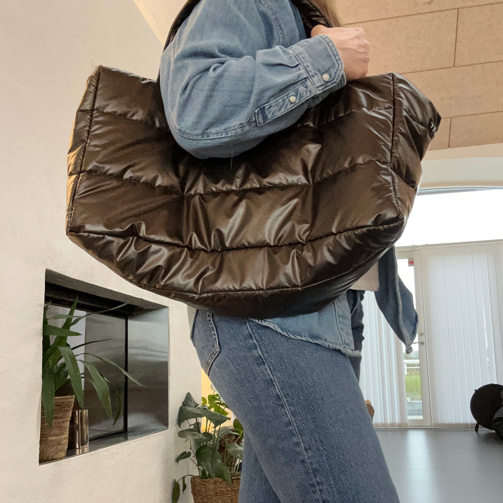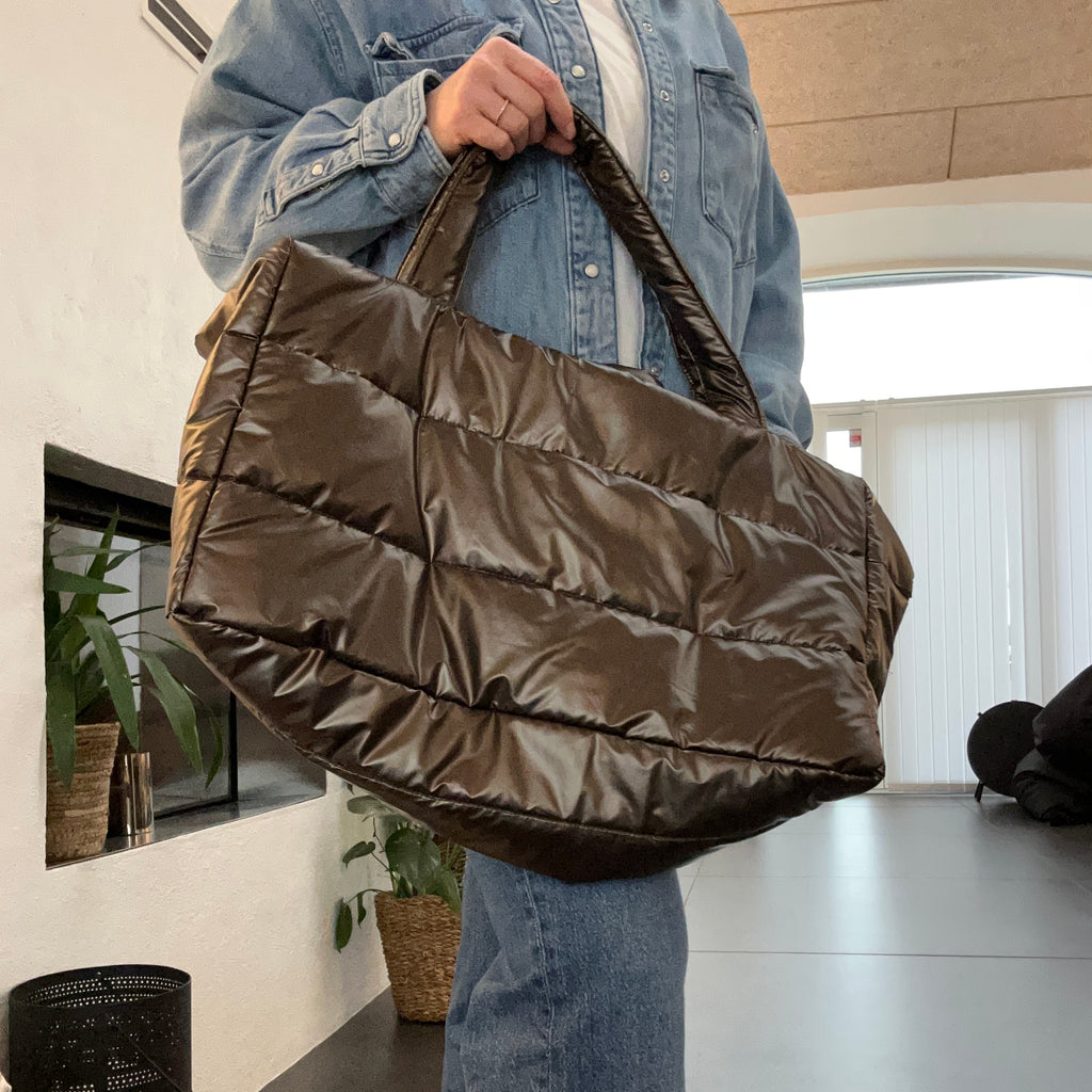 Shopper i brunt skinnende stof.