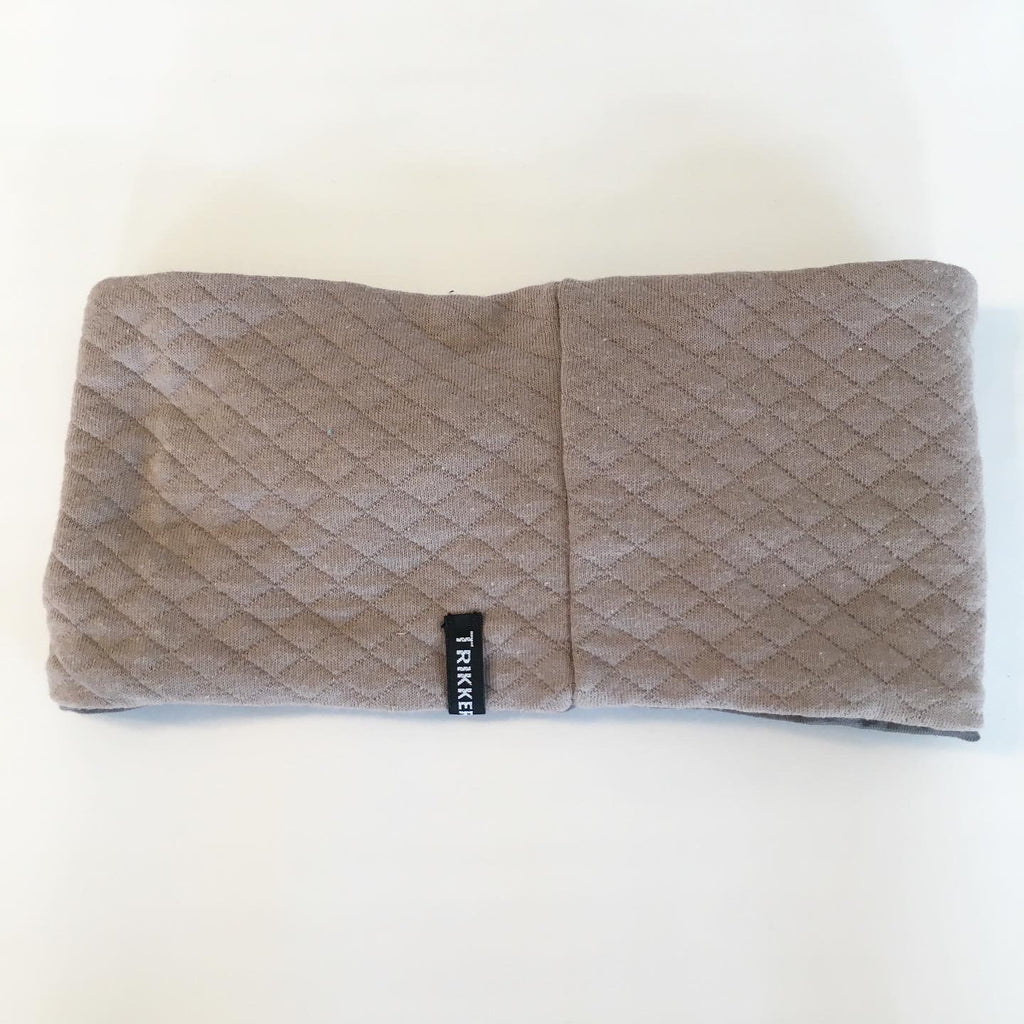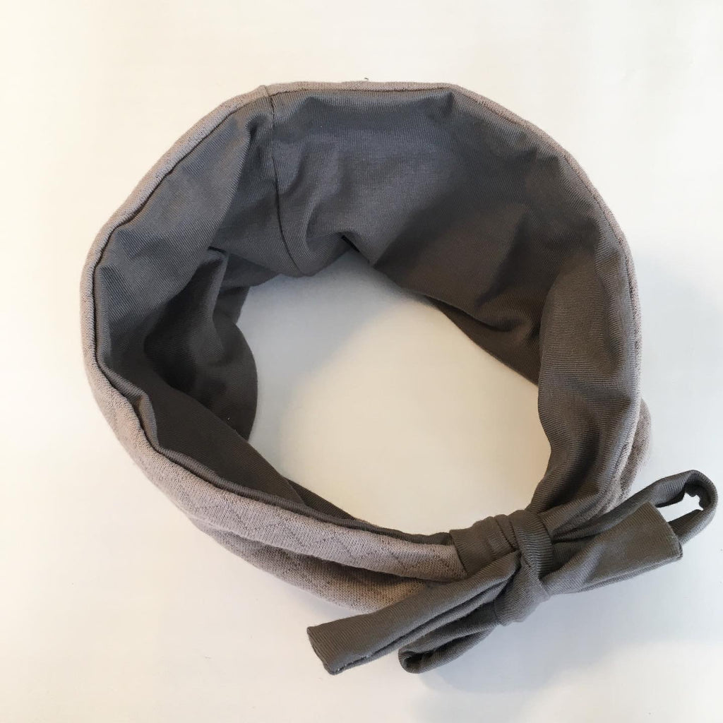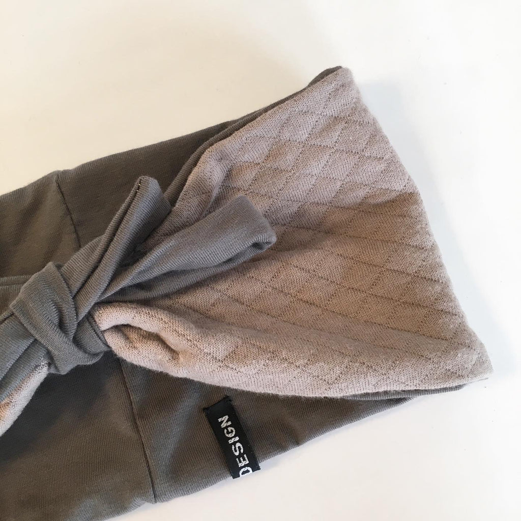 Lækkert Stretch pandebånd i beige og “muldvarp” Stretch. Pandebåndet er vendbart og Sløjfen kan tages af, så man opnår bredere effekt.