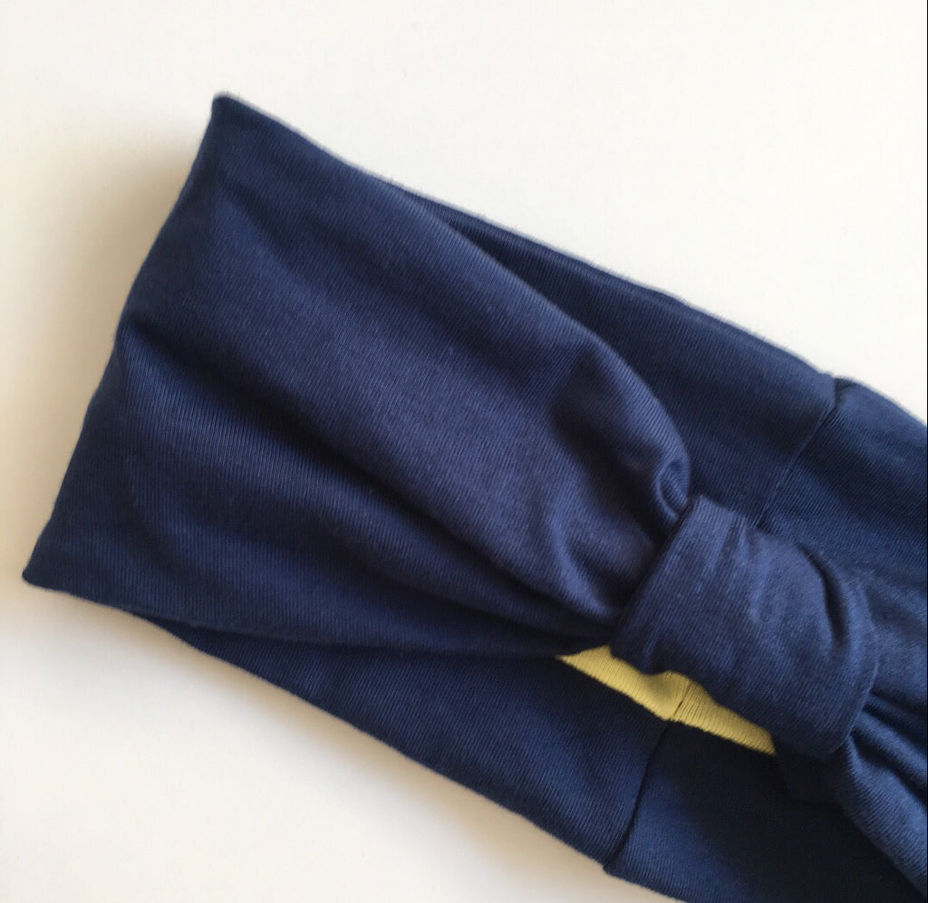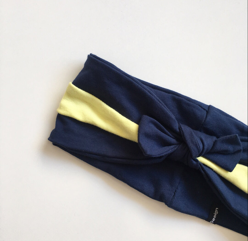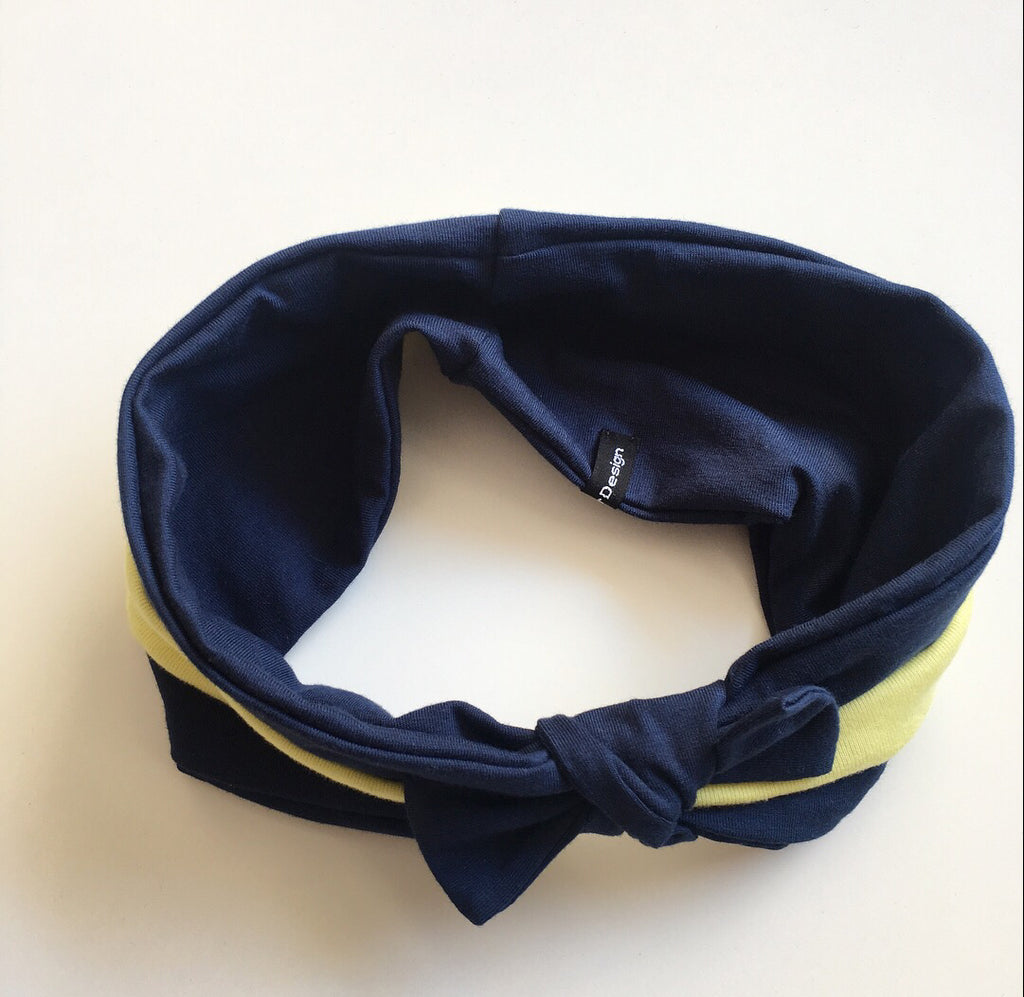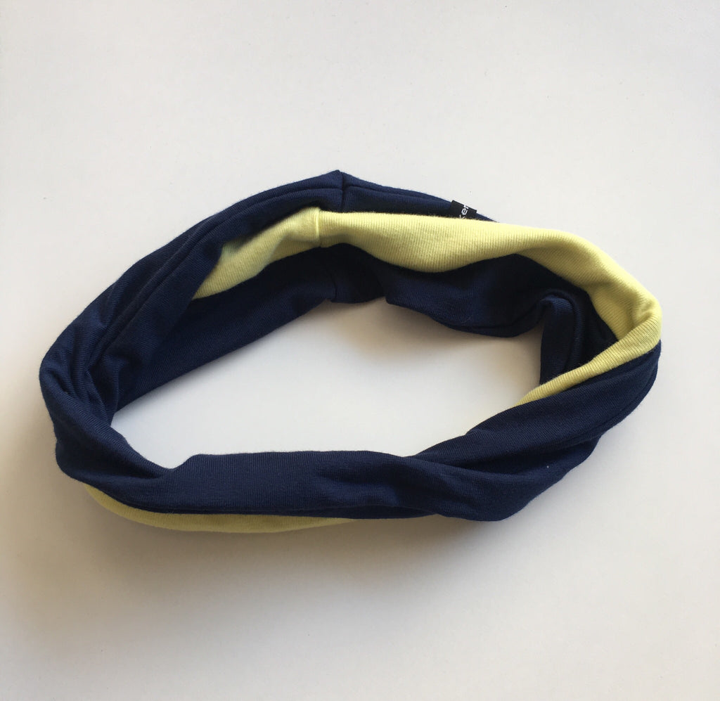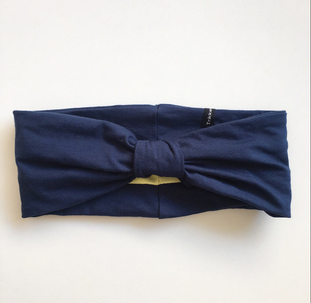 Lækkert jersey pandebånd i mørke blå og lysegult Stretch stof.Vend og drej som du har lyst til og fjern båndet for flere muligheder.