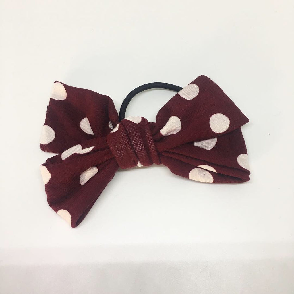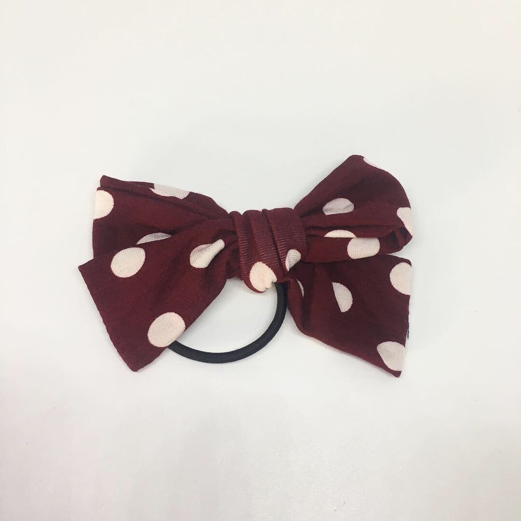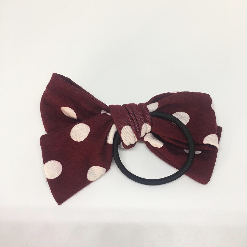 Skøn sløjfe i bordeaux jersey med hvide prikker som er bundet rundt om en tynd elastik. Sløjfen kan tages af, så man evt kan sætte den på en tykkere elastik.