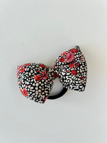 Fluffy sløjfe med blomster i rød, hvid og sort.
