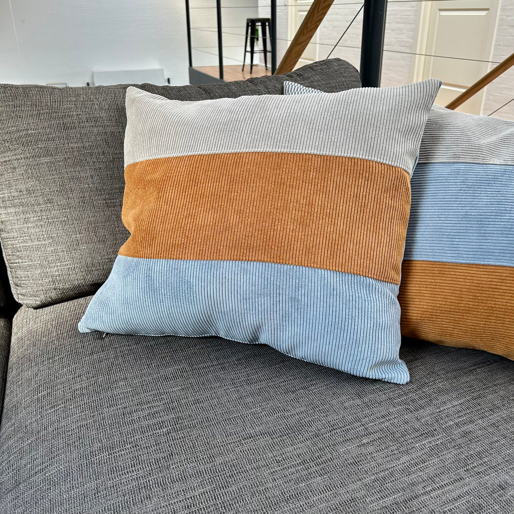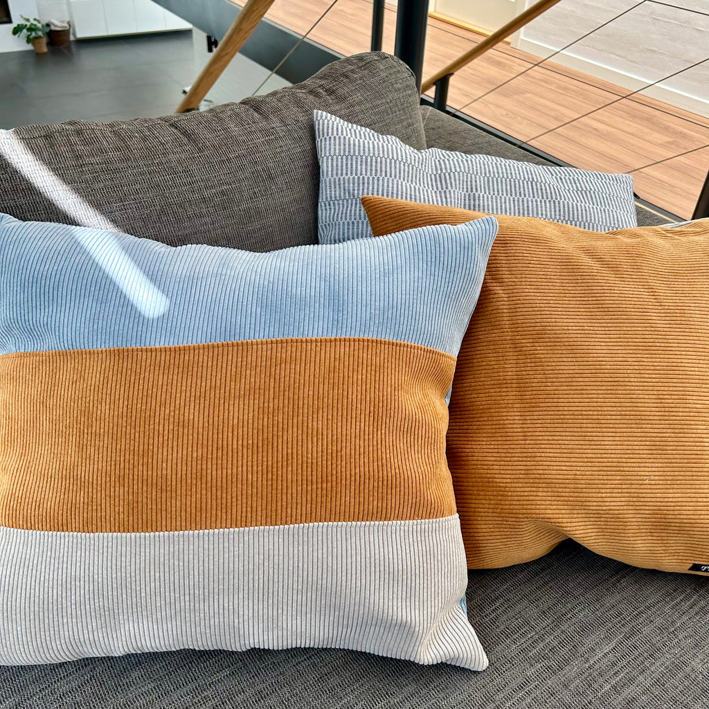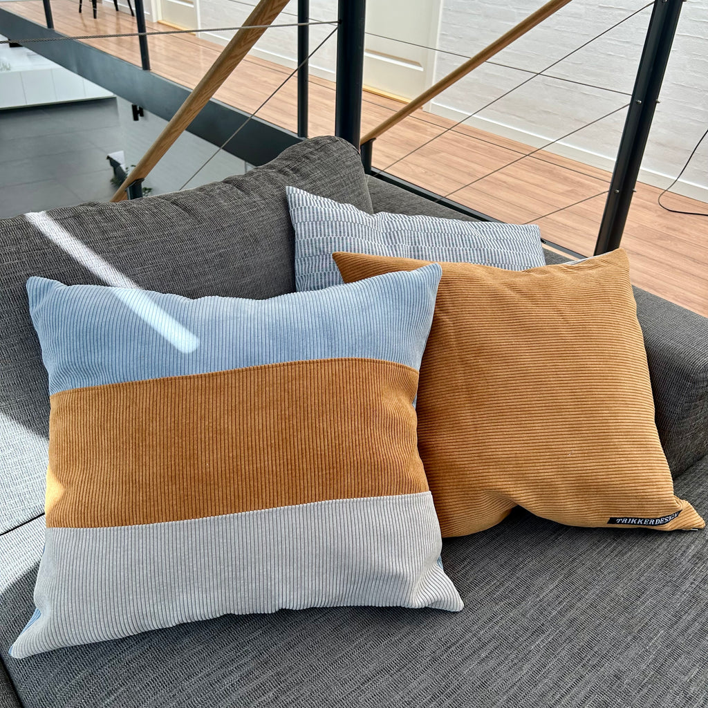 Pudebetræk i gyldenbrun, pastel blå og mørk kit. Pastel blå bagside.