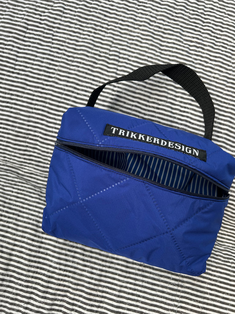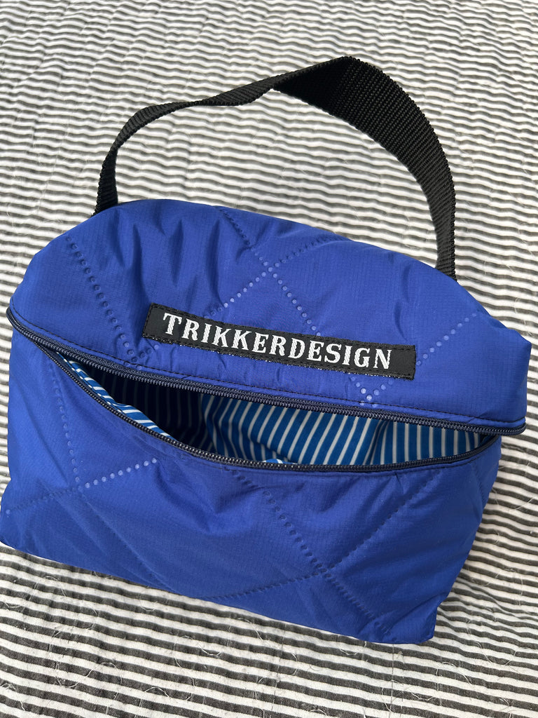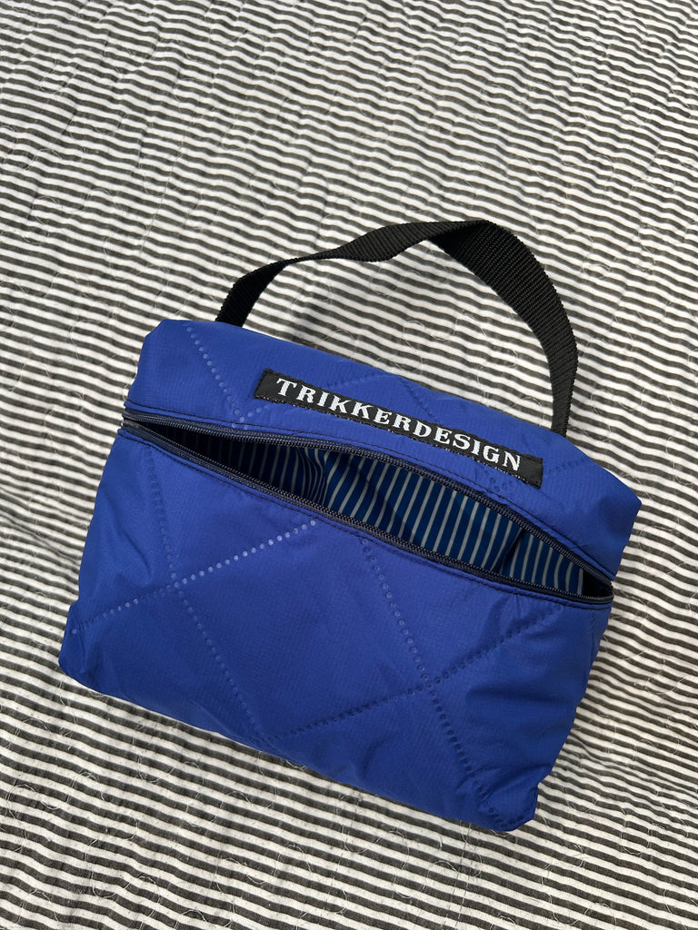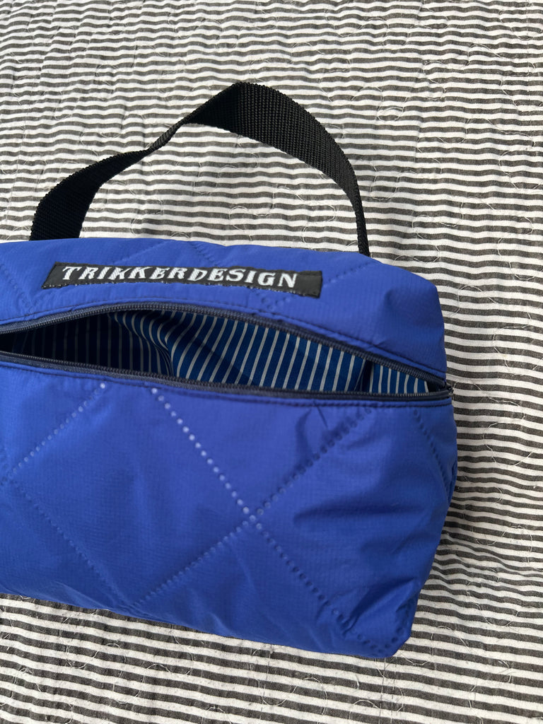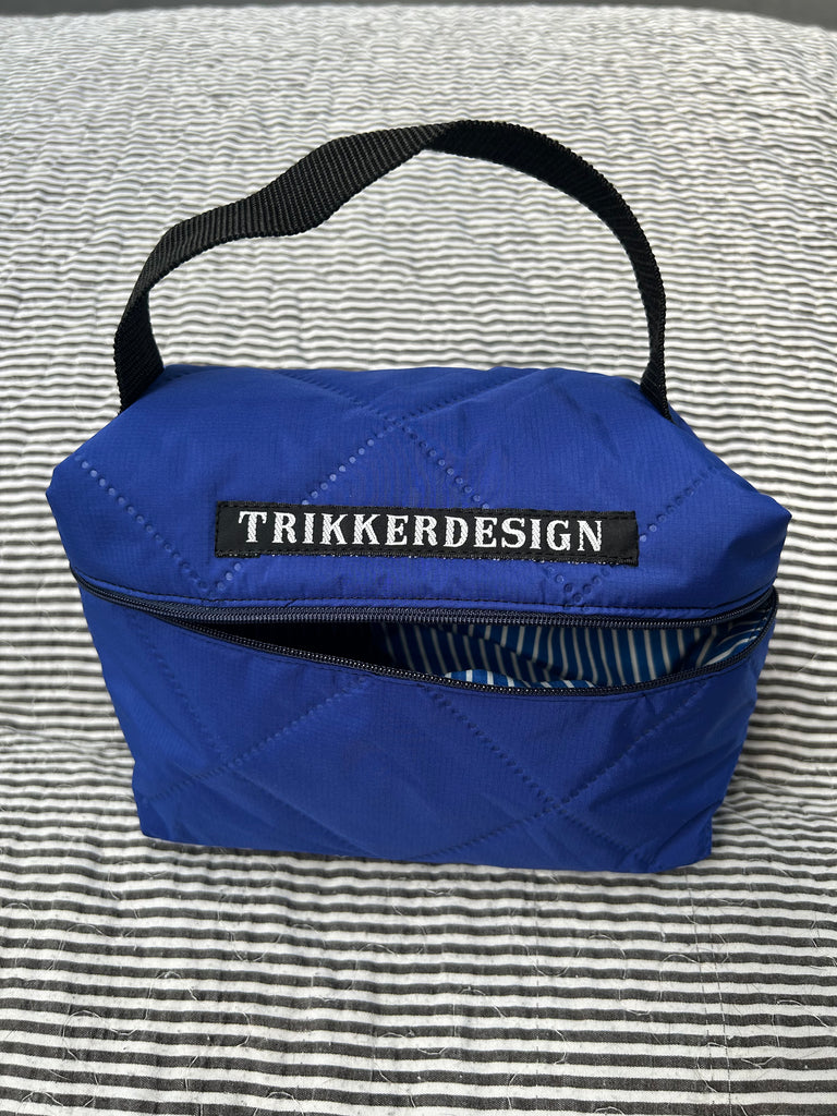 Toilettaske/makeup taske i coboltblå quilt.