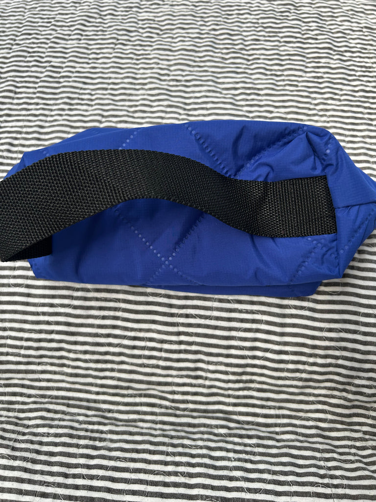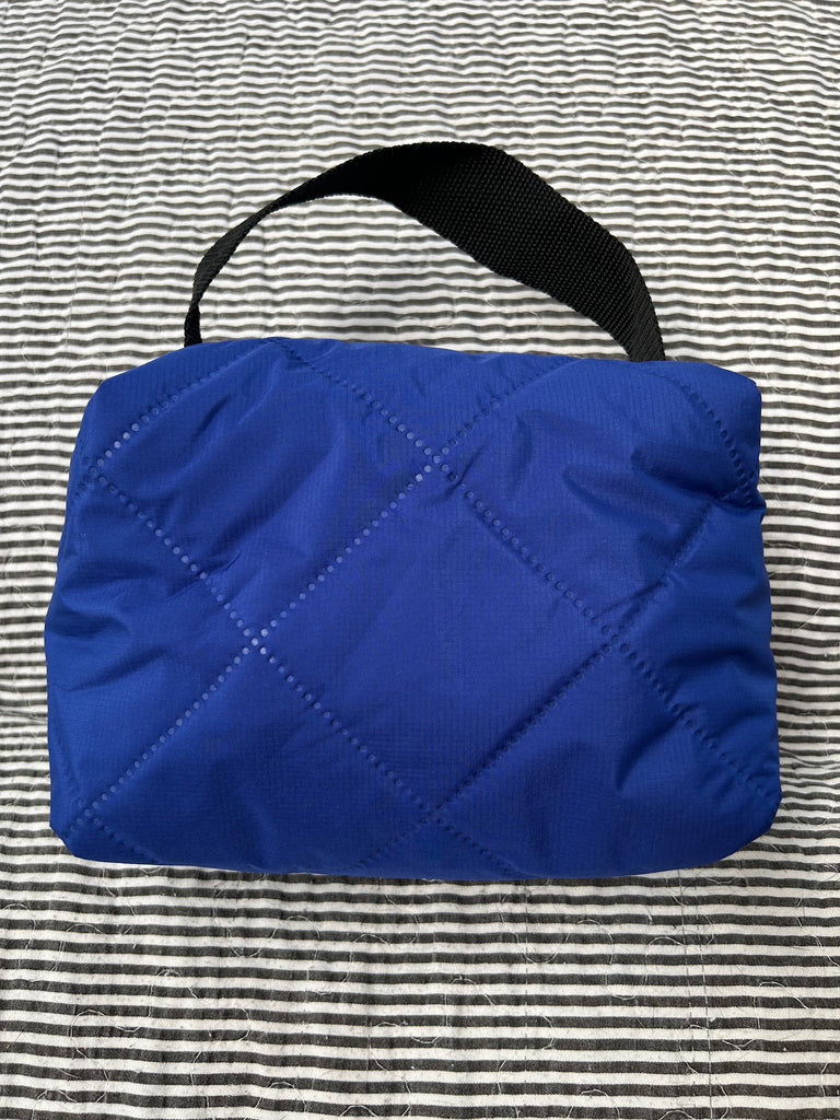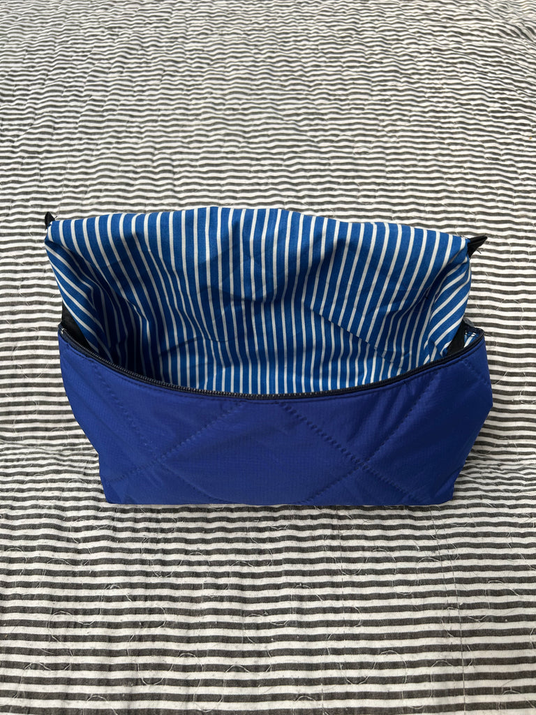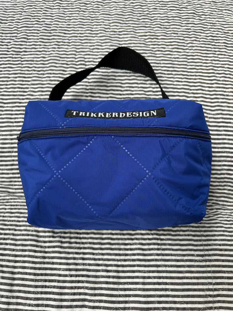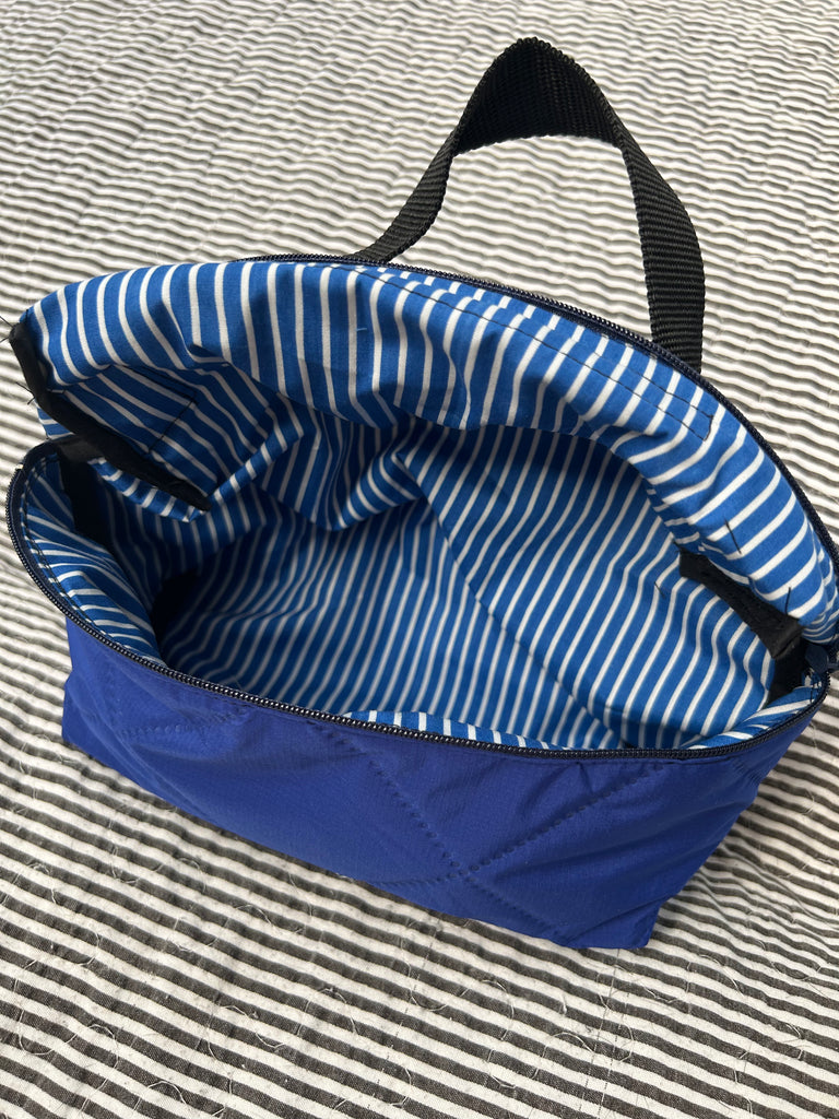Toilettaske/makeup taske i coboltblå quilt.